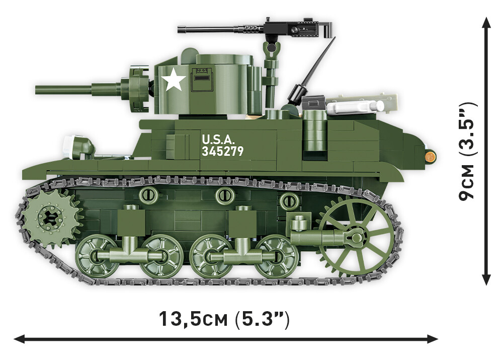 Postavte si model amerického lehkého tanku M3 Stuart v měřítku 1:35. Model má pohyblivé prvky, jako je otočná věž, pohyblivá hlaveň a servisní poklop s maketou motoru pod ním. Sestavený model se skládá z 511 dílků a měří 13,5 cm na délku, 7,5 cm na šířku a 9 cm na výšku. Sada obsahuje dvě figurky.