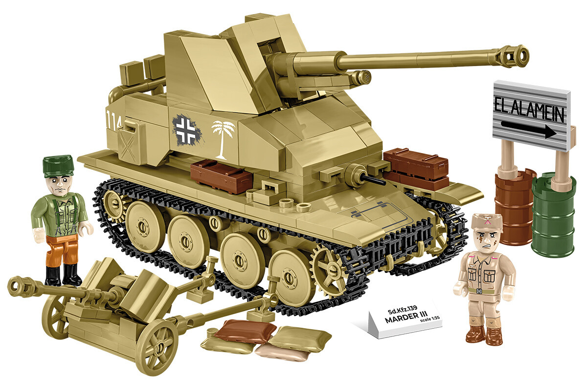 Postavte si model stíhače tanků Marder III a protitankového děla PaK 38 v pouštní kamufláži Afrikakorpsu, a to v měřítku 1:35. Model má pohyblivé prvky, jako je pásová trakce, otočná kola, místo pro figurku v bojovém prostoru. Sestavený model se skládá z 486 dílků a měří 18 cm na délku, 7 cm na šířku a 9 cm na výšku v případě vozidla. Sada obsahuje dvě figurky - mechanika a dělostřelce a řadu dalších prvků pro vytvoření diorámy, jako jsou pytle s pískem, bedny, lopata, barely na benzín a rovněž ukazatel směru na egyptský El Alamein.