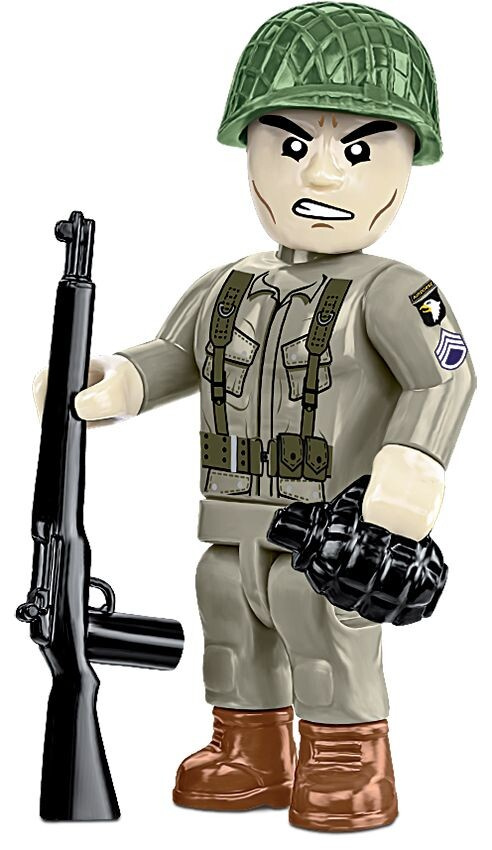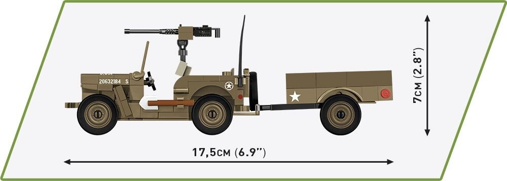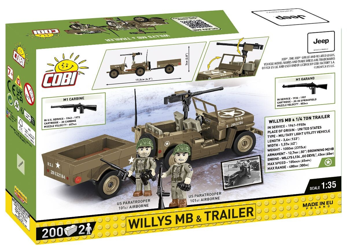 Sestavte si model legendárního terénního automobilu Jeep Willys MB s přívěsným vozíkem v měřítku 1:35! Model v zelené kamufláži je vybaven kulometem Browning upevněným na otočné lafetě. Má sklopný rám čelního skla, vyprošťovací lopatu v úchytu na levém boku a náhradní kolo na zádi vozu. Součástí balení jsou dvě figurky amerických vojáků ze 101. výsadkové divize. Model sestavený z 200 dílků má včetně vozíku rozměry 17,5 cm na délku, 5 cm na šířku a 7 cm na výšku. Stavebnice je vyrobena v oficiální licenci společnosti Jeep.