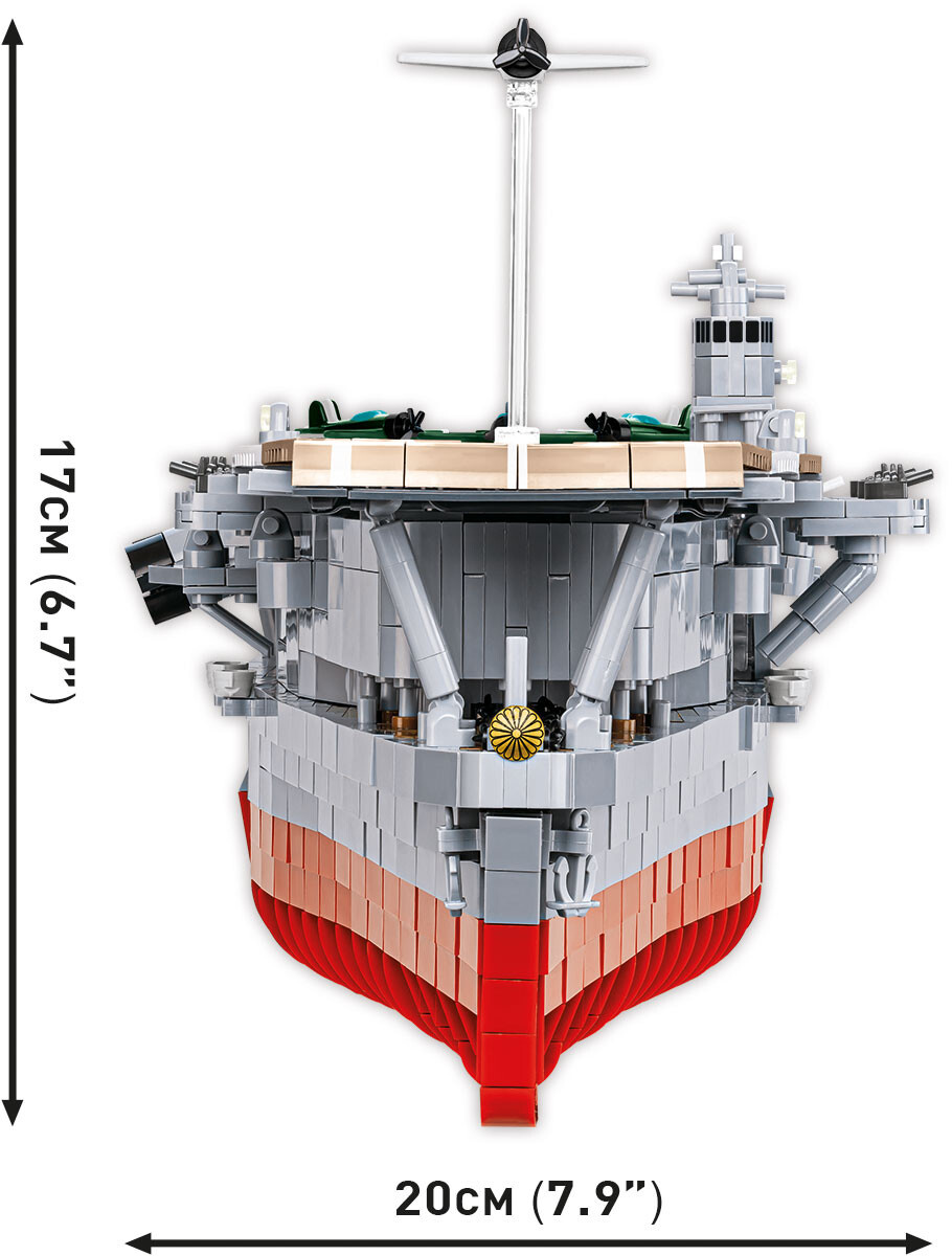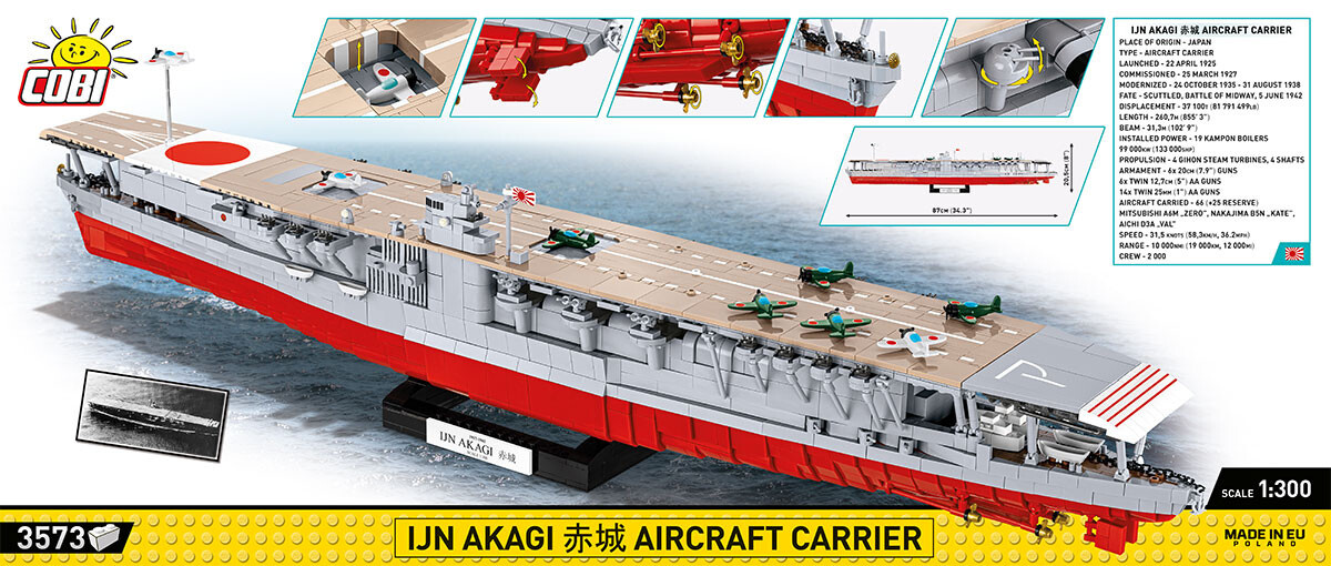 Postavte si model japonské letadlové lodě Akagi v měřítku 1:300. Sestavená loď měří 87 cm na délku a 20,5 cm na výšku. Má mnoho pohyblivých prvků, jako jsou palubní děla a protiletadlové baterie, otočné dělostřelecké věže, kormidla a lodní šrouby. Sada obsahuje speciální výstavní stojan s deskou, na které je vytištěno jméno lodi. Sestavený model se skládá z 3 573 dílků.