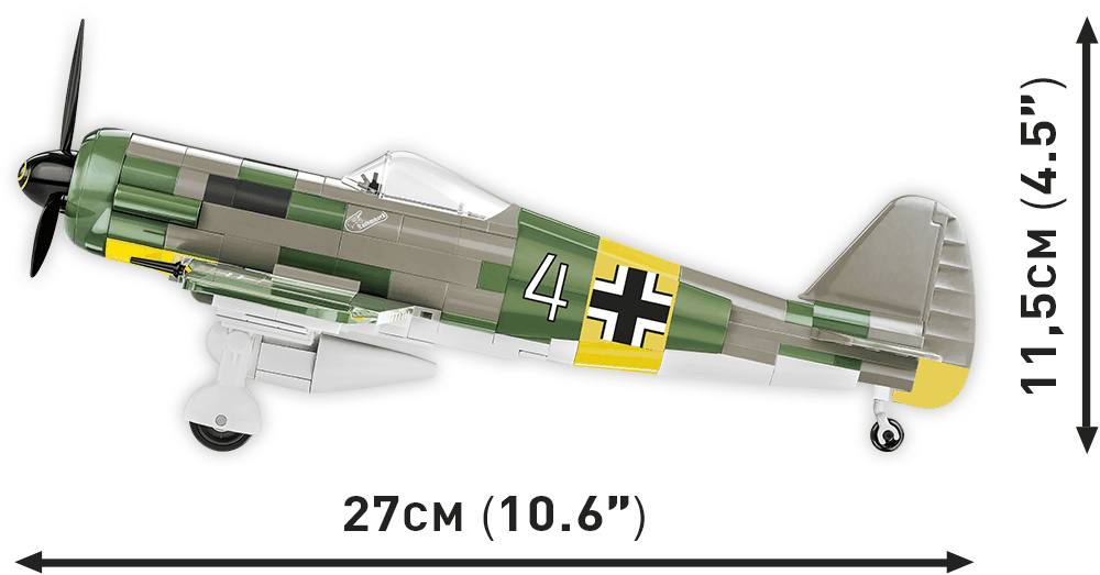 Postavte si model německé stíhačky Focke-Wulf Fw190 A-5 v měřítku 1:32. Model disponuje mnoha pohyblivými částmi, jako jsou otočná vrtule, pohyblivá křidélka nebo zatahovací podvozek. Kokpit lze otevřít a posadit do něj figurku německého stíhacího esa Waltera Nowotny. Sestavený model měří 27 cm na délku a 11,5 cm na výšku. Rozpětí křídel je 32 cm. Stavebnice se skládá z 344 dílů a figurky pilota.