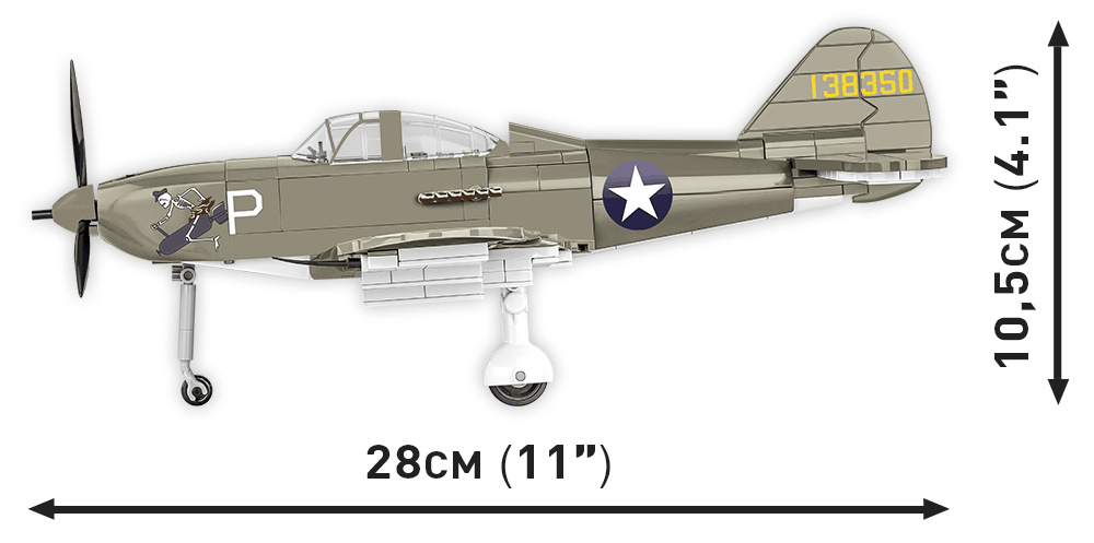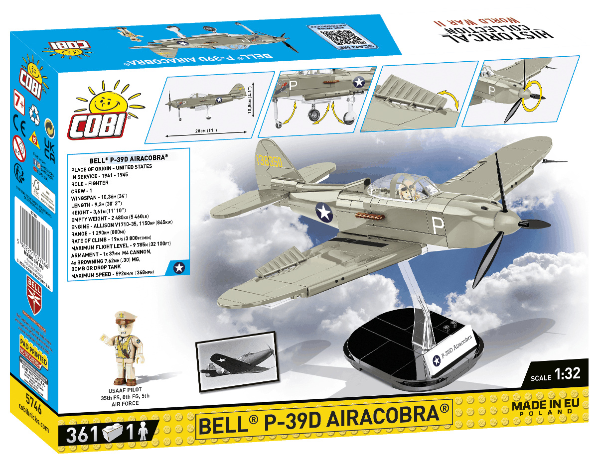 Postavte si model amerického stíhacího letounu Bell P-39D Airacobra v měřítku 1:32. Sestavený model se skládá z 361 dílků a měří 28 cm na délku, 31,5 cm na šířku a 10,5 cm na výšku. Model disponuje mnoha pohyblivými prvky jako je otočná vrtule, pohyblivá křidélka křídla a kola s pryžovými pneumatikami, které lze složit do vodorovné polohy. Kokpit lze otevřít a posadit na sedadlo historickou pilotní postavu! Díky speciálnímu výstavnímu stojanu s destičkou obsahující název letadla a místo pro připevnění figurky vypadá celá sada skvěle. Model využívá odolné potisky a historické značení.
