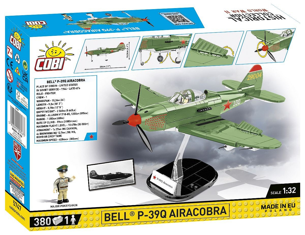 Postavte si model amerického stíhacího letounu BELL® P-39Q AIRACOBRA® v měřítku 1:32. Sestavený model se skládá z 380 dílků a měří 28 cm na délku, 31,5 cm na šířku a 10,5 cm na výšku. Model disponuje mnoha pohyblivými prvky jako je otočná vrtule, pohyblivá křidélka křídel a kola s pryžovými pneumatikami, které lze složit do vodorovné polohy. Kokpit lze také otevřít a posadit do něj historickou pilotní postavu! Díky speciálnímu výstavnímu stojanu s destičkou obsahující název letadla a místo pro připevnění figurky vypadá celá sada skvěle.
