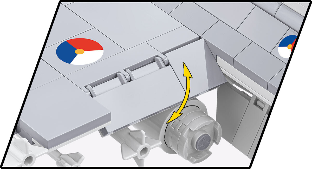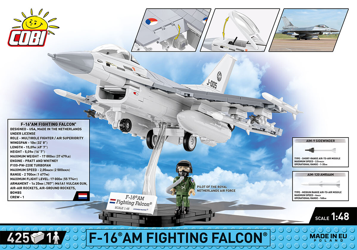 Postavte si model amerického stíhacího letounu F-16 v měřítku 1:48. Sestavený model o rozměrech 31 cm na délku, 22 cm na šířku a 11,5 cm na výšku je vybaven podvěšenými řízenými střelami Storm Shadow, přičemž výzbroj je odnímatelná a může být umístěna na jiné letouny F16 z kolekce Armed Forces! Stavebnice se skládá z 425 dílků. Součástí balení je také figurka holandského pilota vybavená helmou a kyslíkovou maskou s hadicí. Obsahuje potisky s insigniemi nizozemského letectva. Celou sadu doplňuje stojan s tabulkou obsahující název sady, státní vlajku a logo Lockheed Martin.