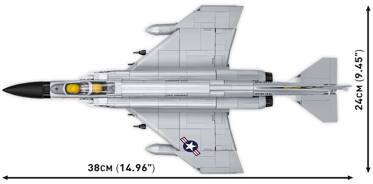 Postavte si model nadzvukového víceúčelového stíhacího letounu F-4 Phantom II v měřítku 1:48. Model má naklápěcí řídící plochy a otevírací kryt kokpitu. Součástí balení jsou také dvě speciálně upravené "půlfigurky" tak, aby se vešly do kokpitu. Sestavený model se skládá ze 703 dílků a měří 38 cm na délku, 24 cm na šířku a 12 cm na výšku.