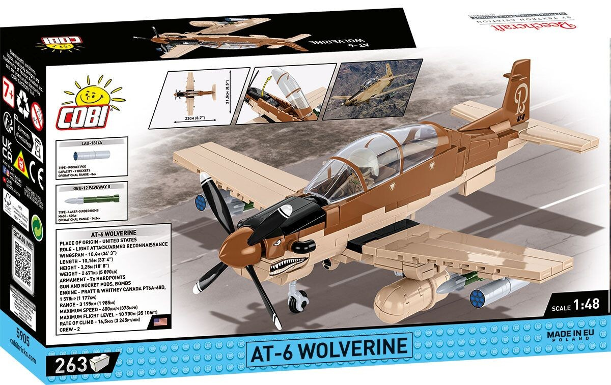 Postavte si model letadla AT-6 Wolverine, moderní verze legendárního T-6 Texanu, v měřítku 1:48. Model má vyklápěcí kryt kokpitu a další pohyblivé prvky. Sestavený model se skládá z 263 dílků a měří 22 cm na délku, 21,5 cm na šířku a 8 cm na výšku.