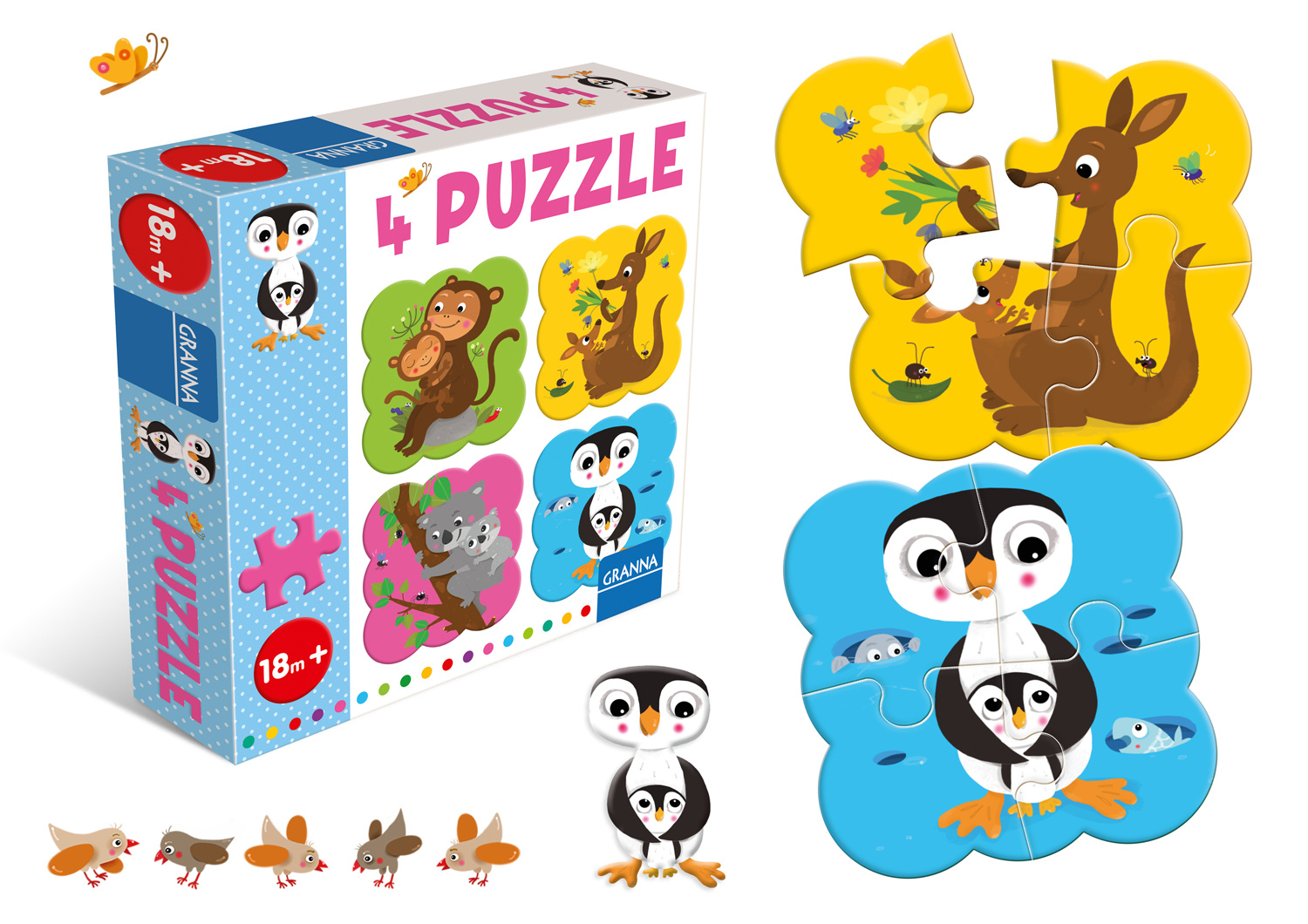 Obrázky zvířátek sestávají ze 4 dílů puzzle.
