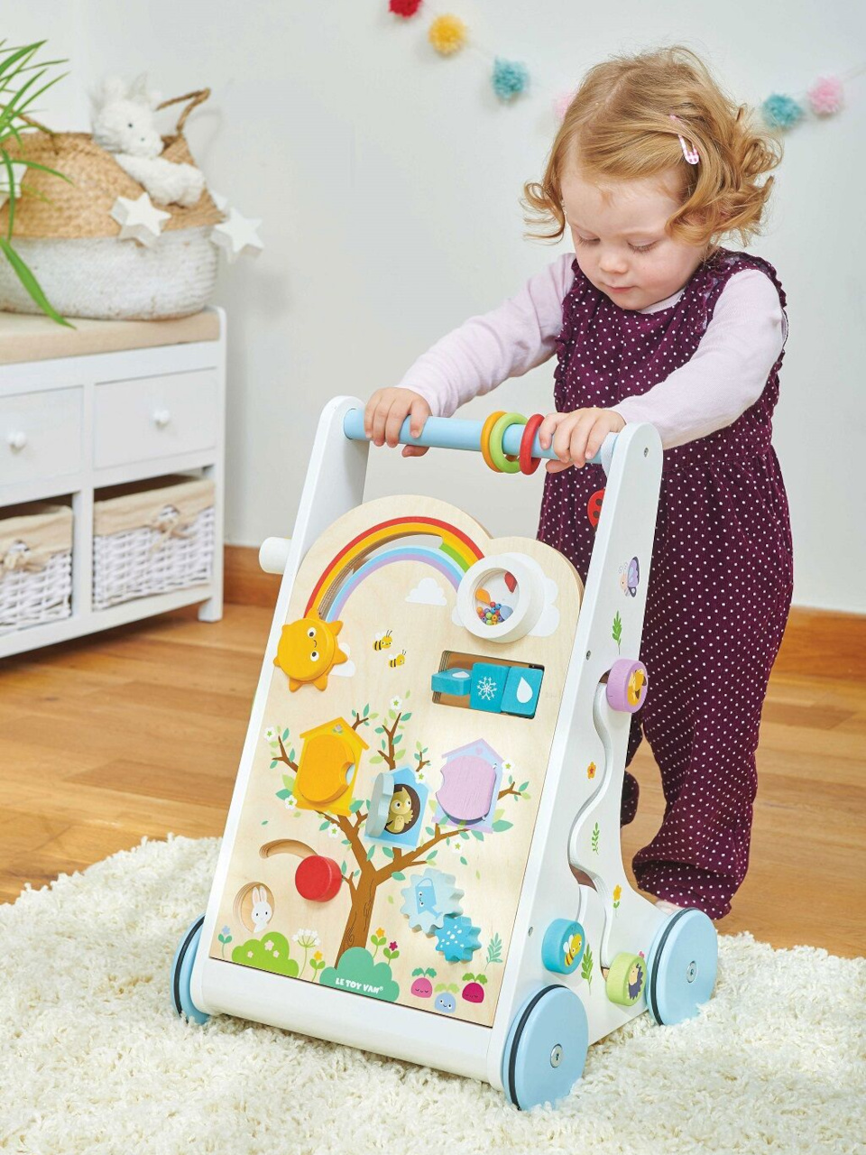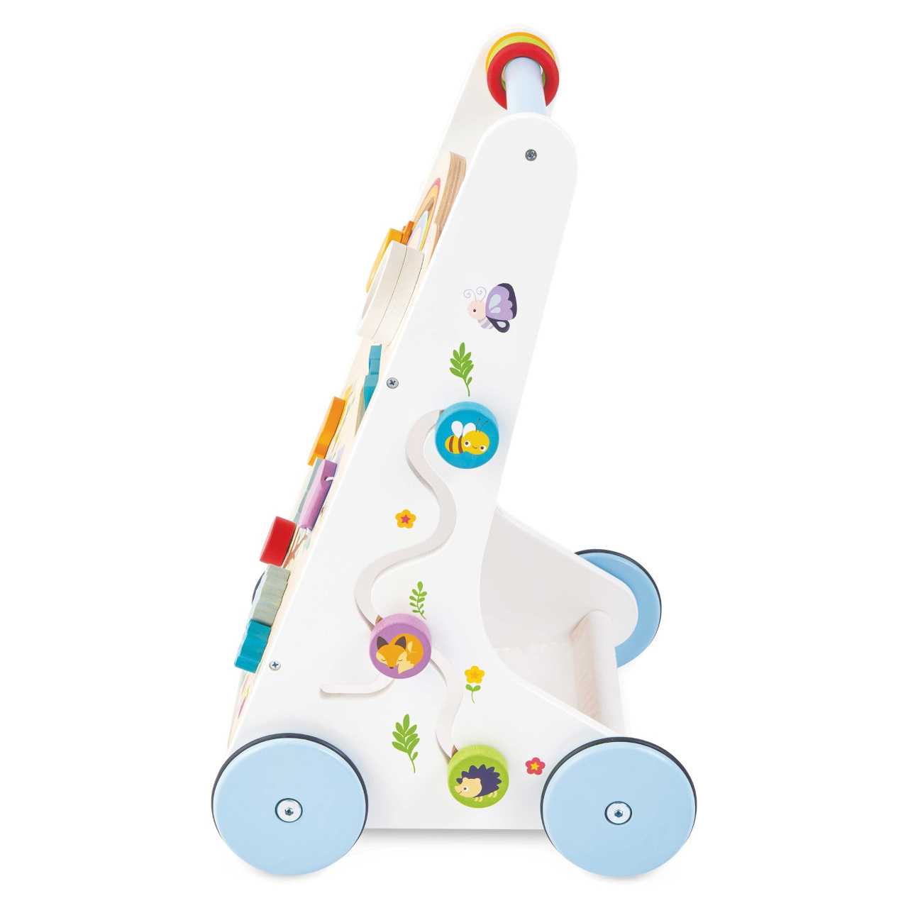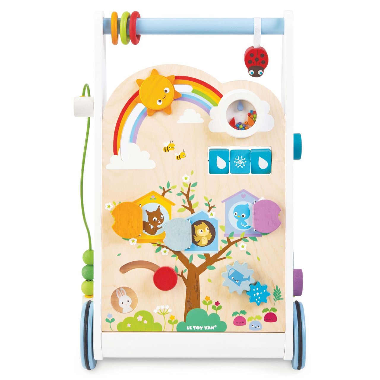 Dřevěné chodítko s aktivitami bude perfektním dárkem pro děti, které začínají chodit. Podpoří je a dodá jim odvahu při prvních krůčcích. Krásná hračka v motivu přírody, s ilustracemi lesních zvířátek a dalšími roztomilými detaily. Senzorická hračka s 12 aktivitami děti podpoří v představivé hře. Je vyrobena z odolného a udržitelného kaučukového dřeva, malována netoxickými barvami na bázi vody.
