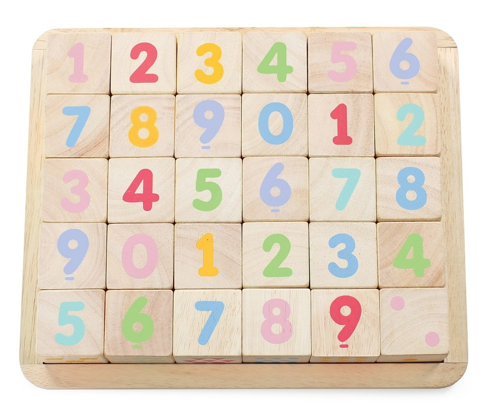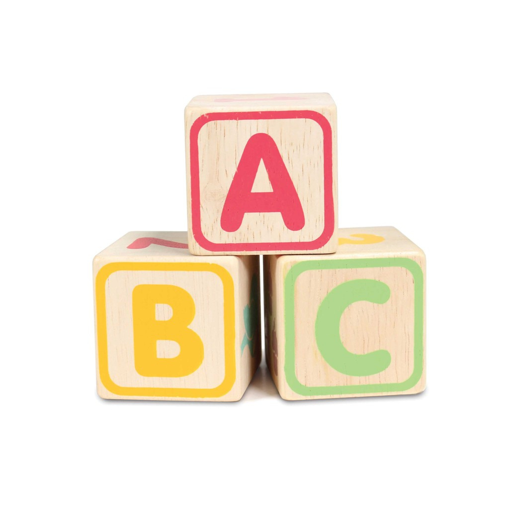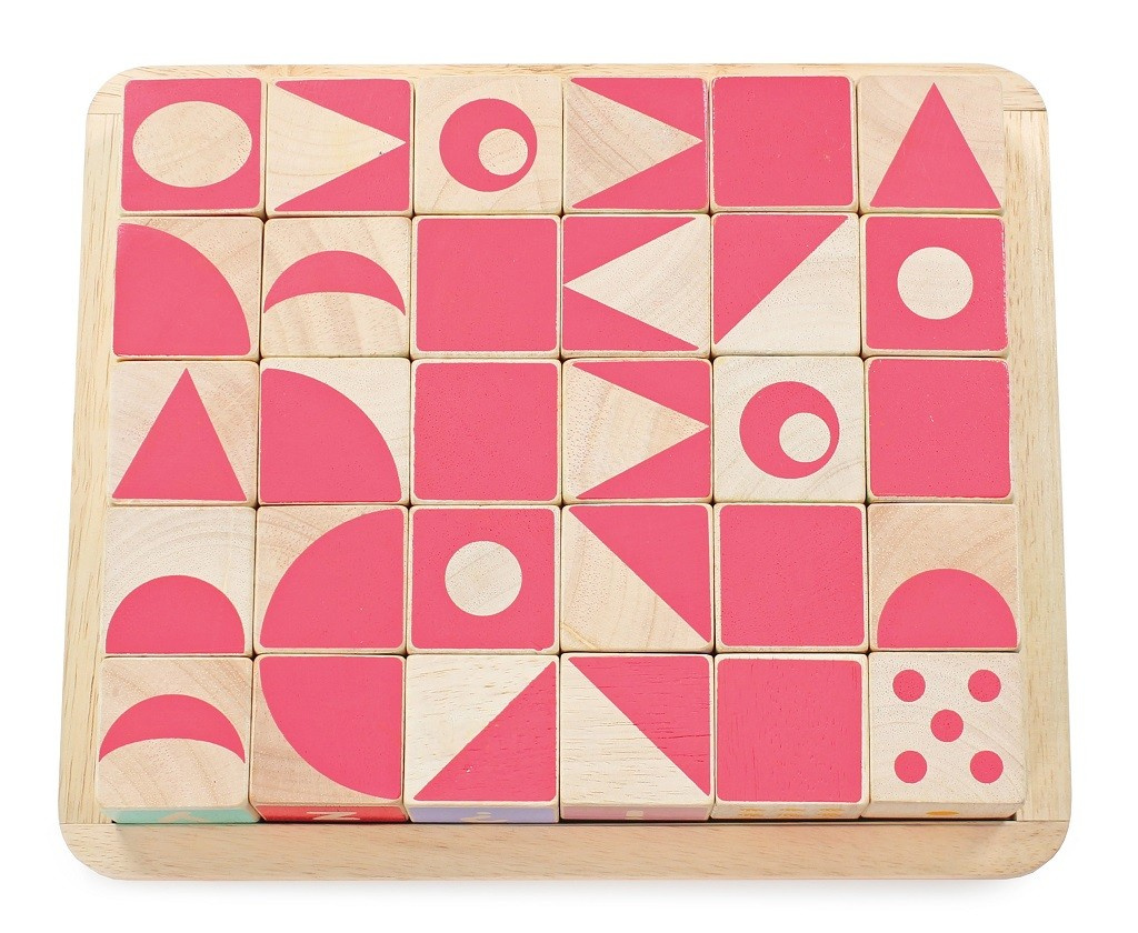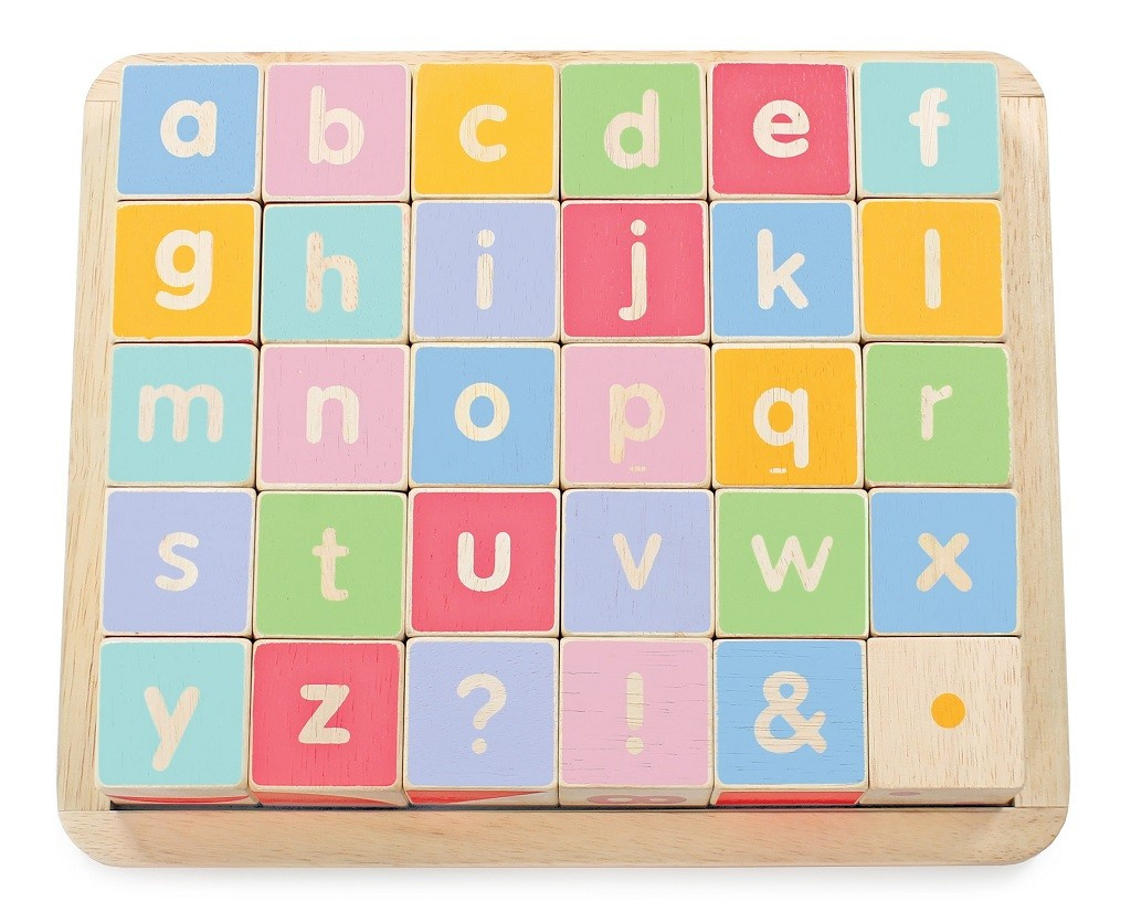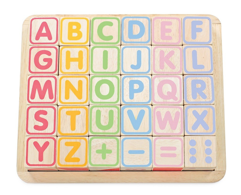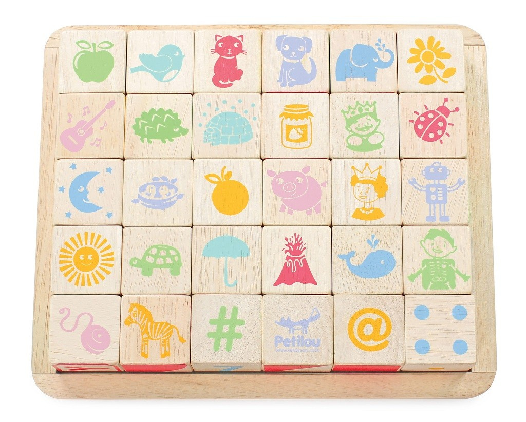 Naučte nejmenší děti abecedu zábavnou formou! Kostky jsou tradiční hmatovou hračkou, která rozvíjí zručnost, koordinaci ruka-oko, motoriku a prostorovou představivost. Každá z 30 kostek je ručně natištěna sítotiskem, každá je jedinečná. Kostky mají na každé ze stran jiný design – číslice, písmena, obrazce, zvířátka… Hračka je vyrobena z odolného kaučukového dřeva a malována barvami na bázi vody, které se neodlupují. Kostky i úložná deska mají zaoblené hrany, tato hračka bez obsahu plastu je tak bezpečná pro děti.