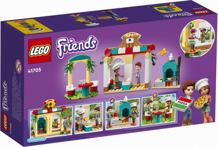 Stavebnica obsahuje model reštaurácie, kde môžu deti na pokladni prijímať platby a v časti s posedením obsluhovať hostí. Vďaka peci na pizzu a ďalším doplnkom sada deťom ponúkne flexibilné herné možnosti pri prevádzkovaní vlastnej pizzérie. Súčasťou sú aj 2 postavy LEGO Friends a rad nápaditých prvkov, ktoré poslúžia ako inšpirácia pre kreatívne príbehy. A až budú všetky pizze upečené a zjedené, bude sa farebný model skvele vynímať na výstavke v detskej izbe.