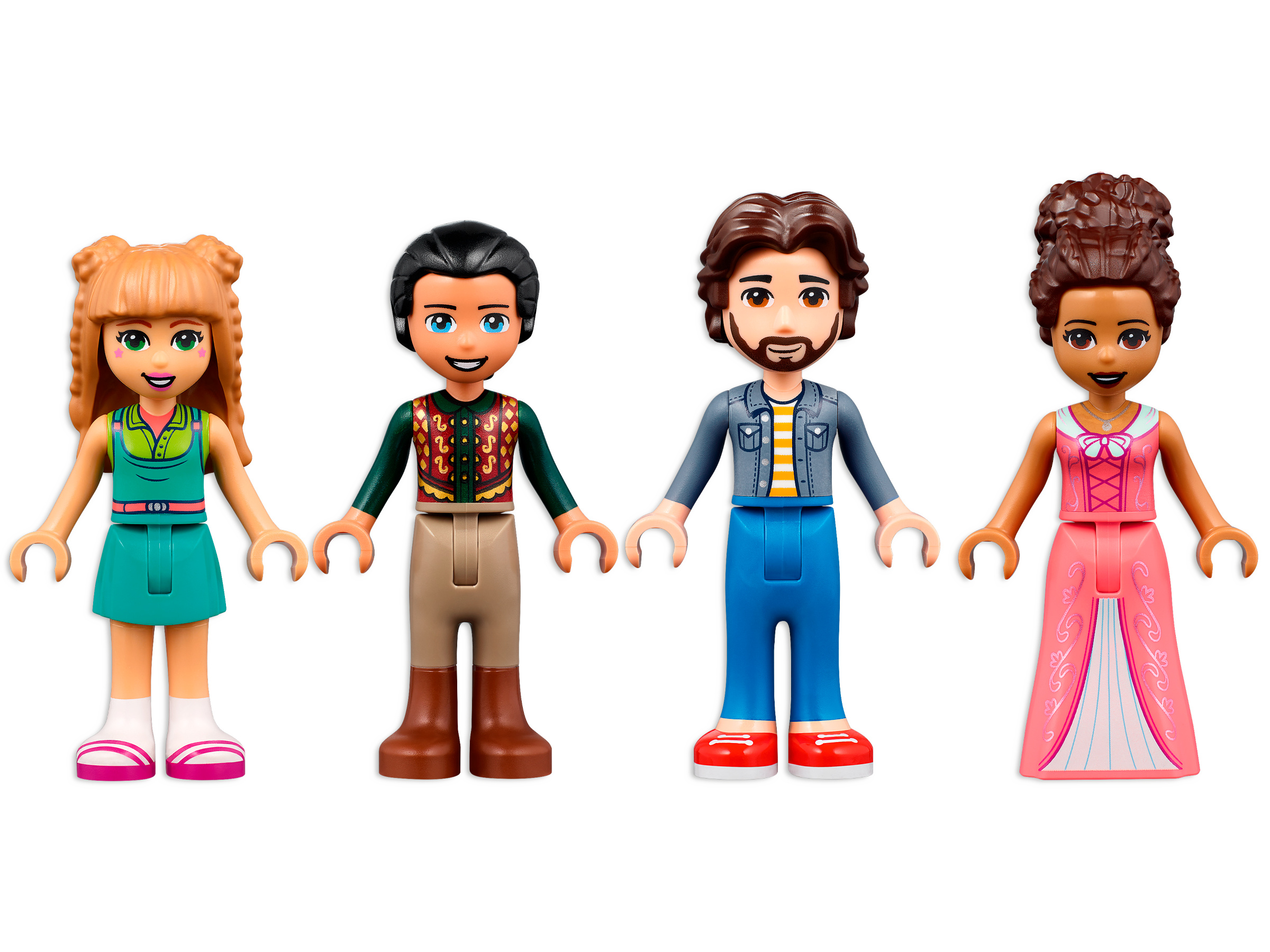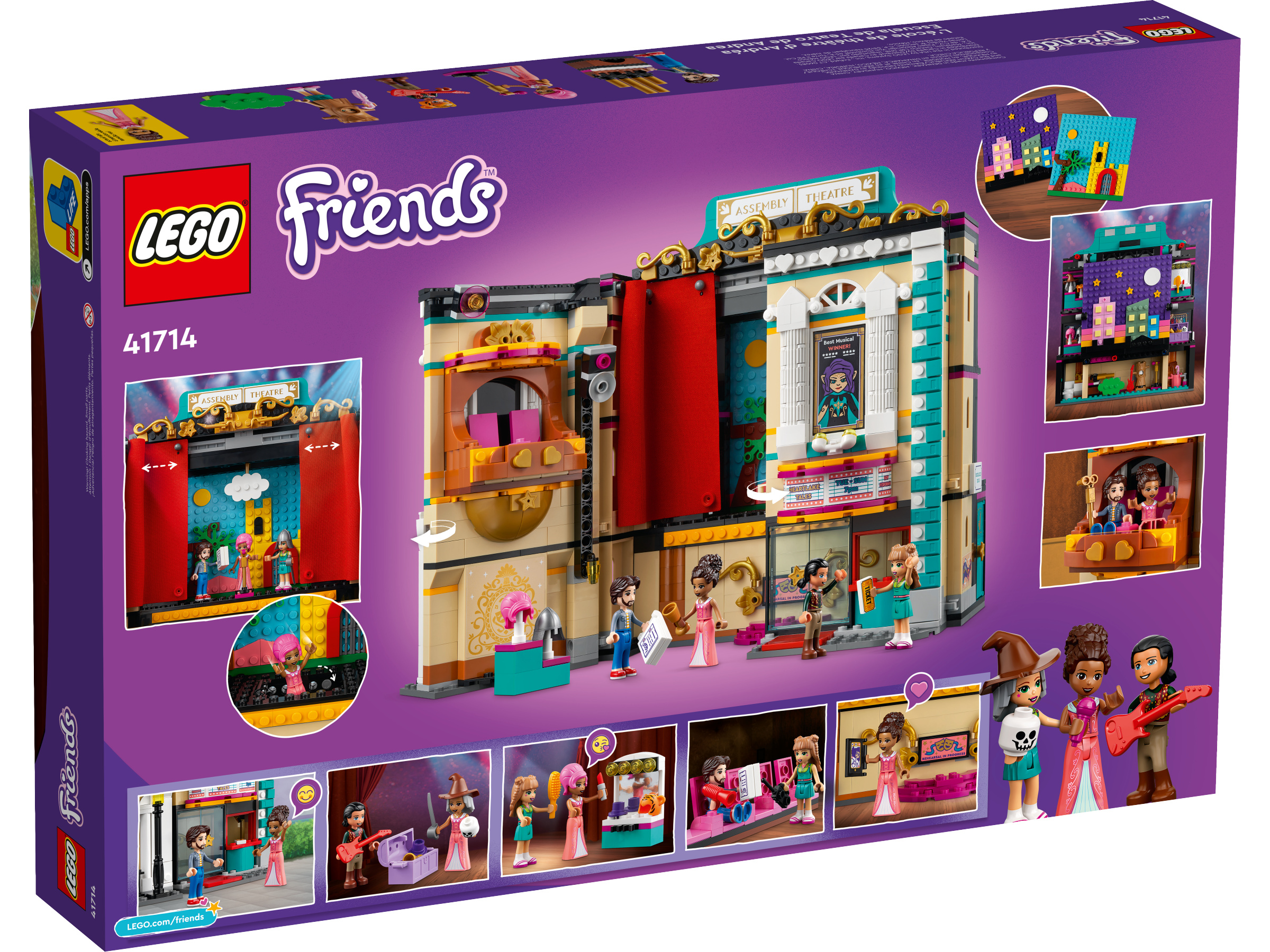 Za viktoriánskou fasádou sa ukrýva divadlo, vrátane popredných kresiel na prízemí a balkóne. Odhrňte látkovú oponu a pokochajte sa 2 scenériami – stredovekým hradom a nočným mestom. Otočte divadlo a prezrite si osvetľovaciu techniku a šatňu, kde sa postavy pripravujú na vystúpenie - úplne ako v skutočnosti! Nechýbajú ani rekvizity, s ktorými si deti budú môcť vymýšľať vlastné dramatické scény. Kamarátky LEGO® Friends Andrea, Ollie a Freya môžu pilovať svoje herecké party pod vedením profesora Adriana.