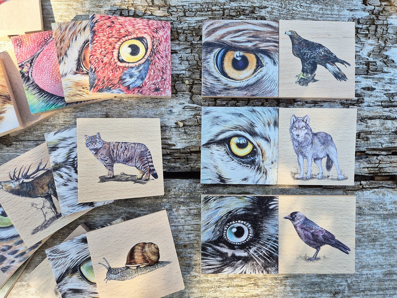 Sada obsahuje 40 dřevěných dílků, z nichž polovina zobrazuje zvířata a druhá polovina detailní kresby jejich očí. Cílem hry je najít správné dvojice – tedy spojit každé zvíře s jeho okem. Pozornost je třeba věnovat barvě, tvaru a drobným rozdílům – každé oko je originál, stejně jako živočich, ke kterému patří.