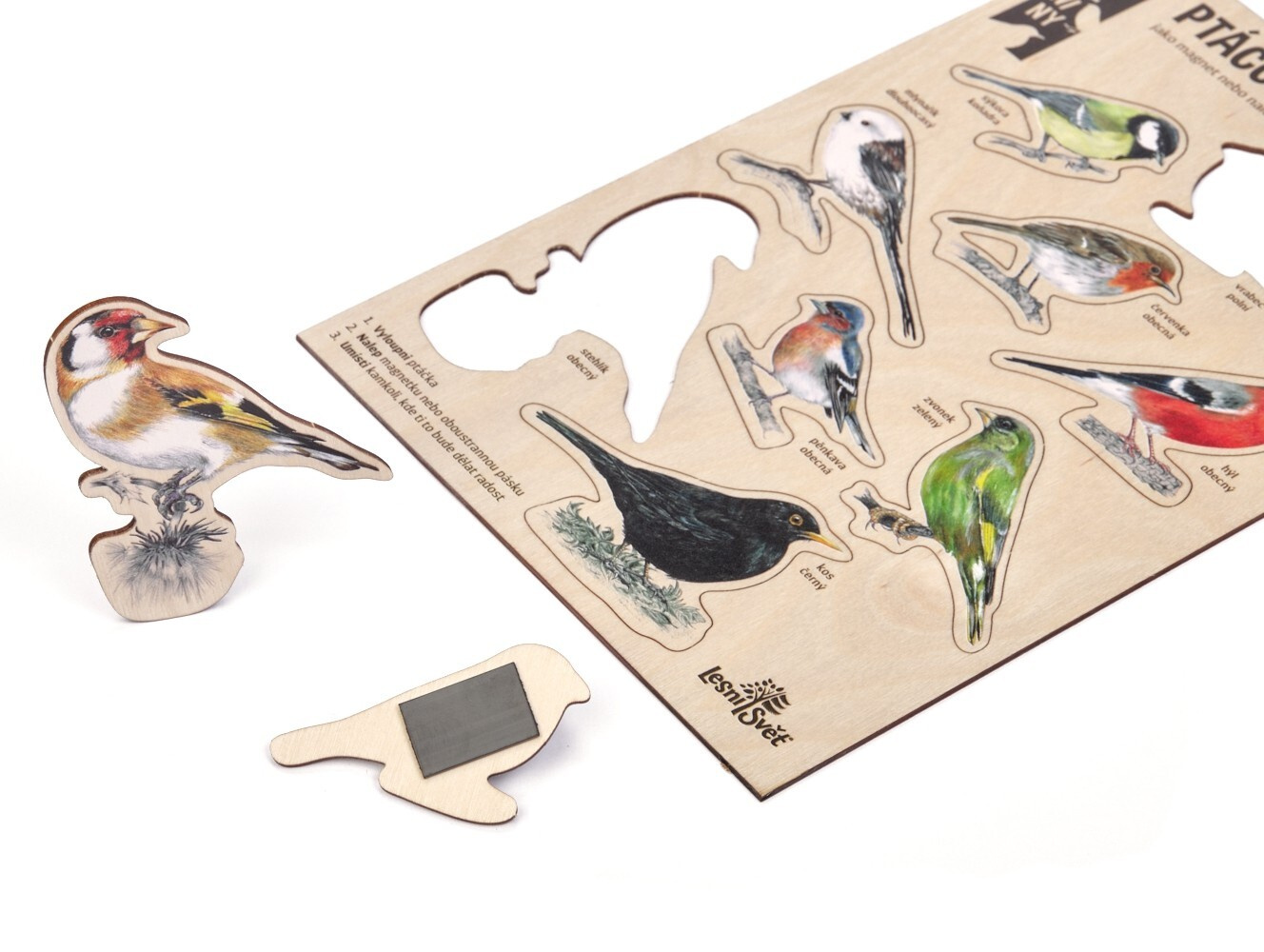 Sada obsahuje 8 různých ptáků, které mohou děti vyloupnout a díky přiložené magnetické nebo oboustranné lepící pásce si je mohou připevnit kdekoliv – na lednici, nábytek či stěny.