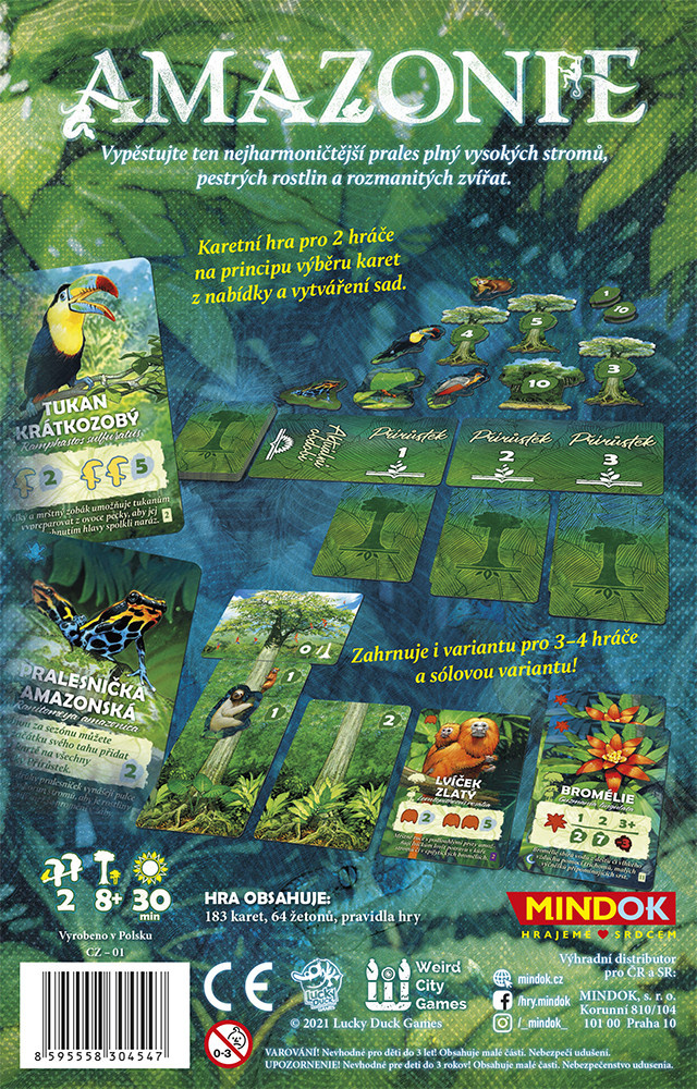 Ve hře Amazonie se dva hráči snaží dát dohromady co nejlepší amazonský prales. Hráči postupně získávají karty, staví z nich vysoké stromy a snaží se svou džungli i co nejlépe osadit faunou i flórou. Ale pozor, v džungli číhají i různá nebezpečí, například nemoci či požáry.