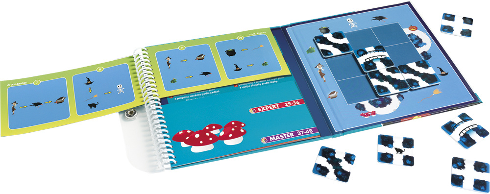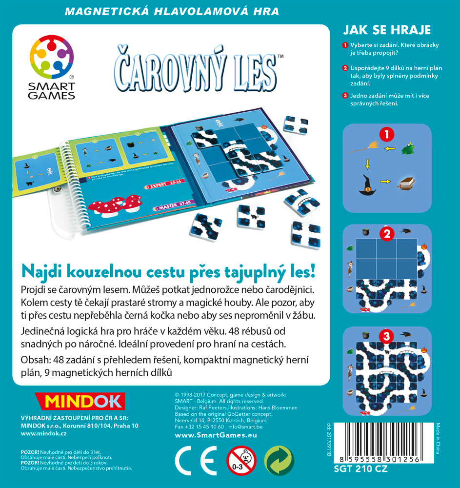 Hlavolamová hra ze série magnetických cestovních her z řady SMART games. Najdi kouzelnou cestu přes tajuplný les! Projdi se čarovným lesem. Můžeš potkat jednorožce nebo čarodějnici. Kolem cesty tě čekají prastaré stromy a magické houby. Ale pozor, aby ti přes cestu nepřeběhla černá kočka nebo aby ses neproměnil v žábu. Jedinečná logická hra pro hráče v každém věku. 48 rébusů od snadných po náročné. Ideální provedení pro hraní na cestách.