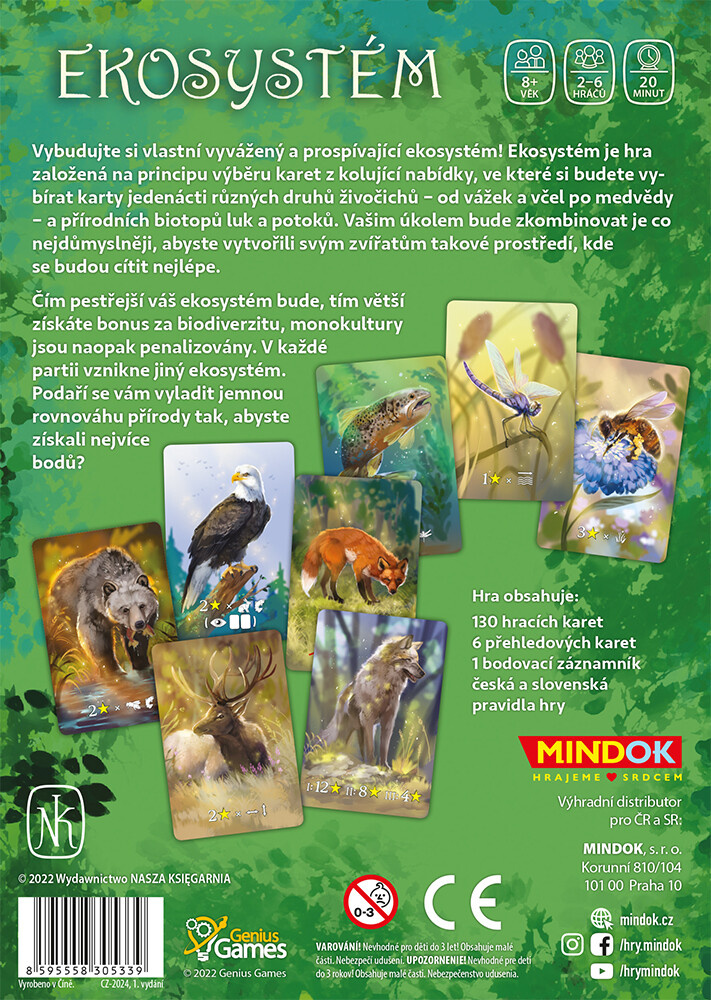 Ekosystém je karetní hra pro 1-6 hráčů, ve které si každý buduje vlastní ekosystém plný rozmanitých živočichů a prostředí. Pomocí mechanismu draftu si budete vybírat karty a strategicky je umisťovat do své mřížky 5×4.