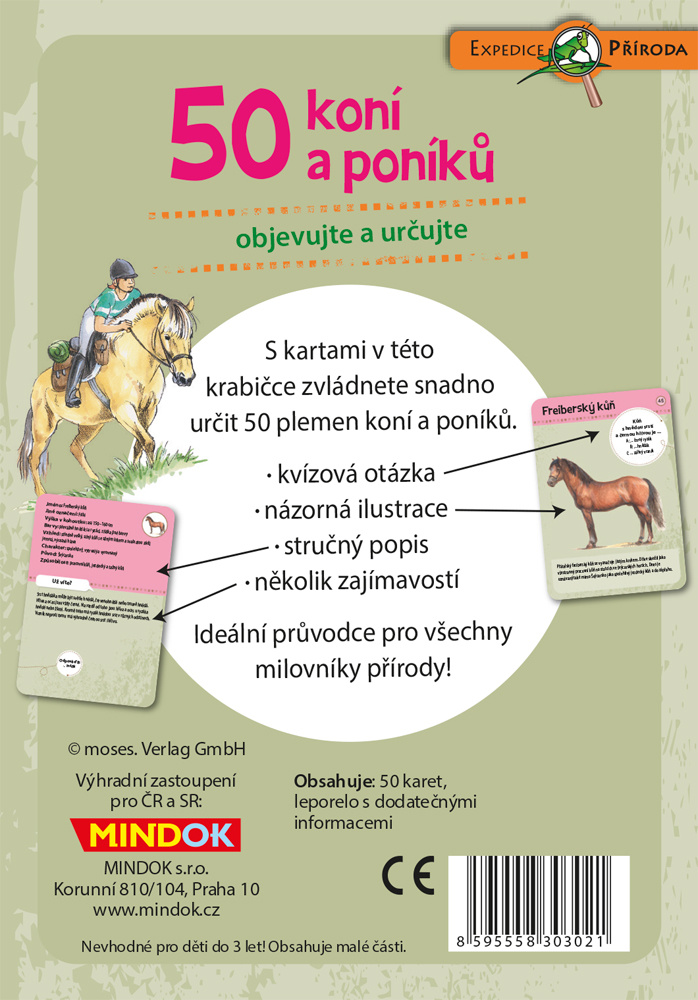 Díky kartám v této krabičce zvládnete hravě určit 50 koní a poníků. Na kartách najdete kvízovou otázku, názornou ilustraci, základní informace a také několik zajímavostí. Ideální průvodce pro všechny milovníky přírody!