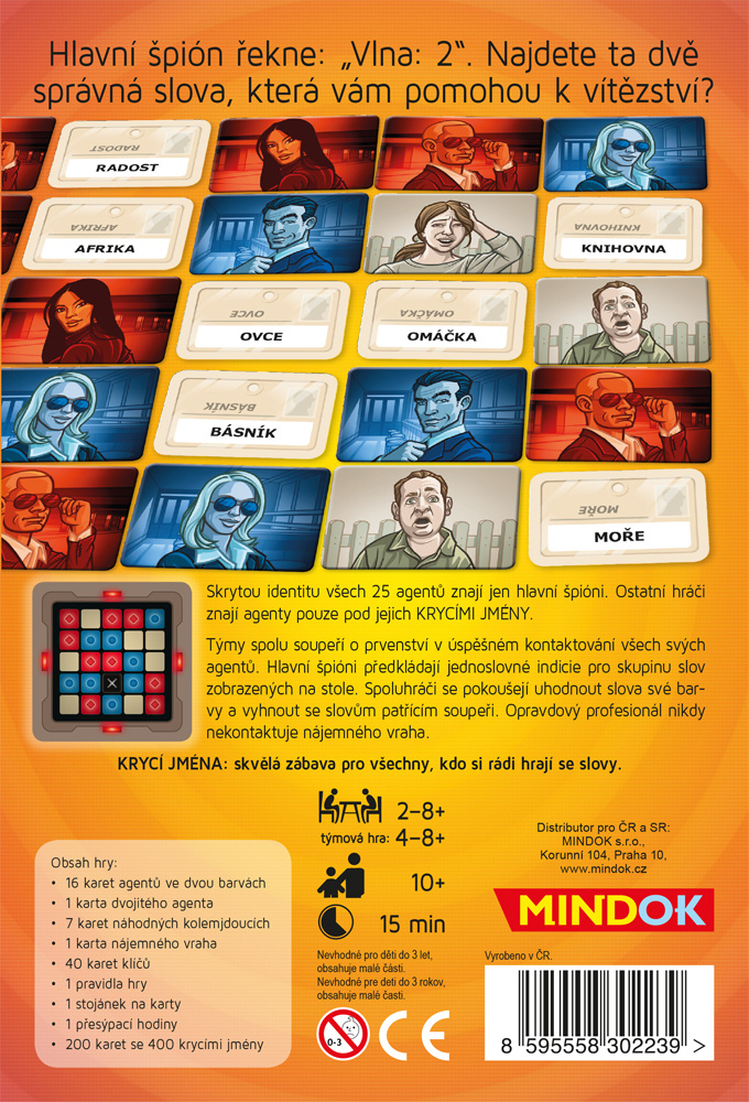 Hlavní špión řekne: "Vlna 2". Najdete ta dvě správná slova, která vám pomohou k vítězství? Skrytou identitu všech 25 agentů znají jen hlavní špióni. Ostatní hráči znají agenty pouze pod jejich KRYCÍMI JMÉNY. Týmy spolu soupeří o prvenství v úspěšném kontaktování všech svých agentů. Hlavní špióni předkládají jednoslovné indicie pro skupinu slov zobrazených na stole. Spoluhráči se pokoušejí uhodnout slova své barvy a vyhnout se slovům patřícím soupeři. Opravdový profesionál nikdy nekontaktuje nájemného vraha. KRYCÍ JMÉNA: skvělá zábava pro všechny, kdo si rádi hrají se slovy.