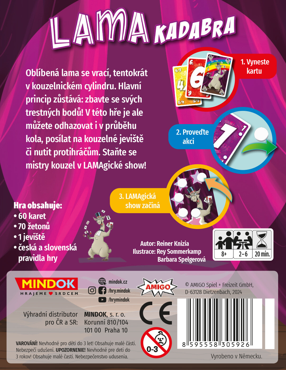 Hra LAMA Kadabra navazuje na populární hru LAMA, ale tentokrát se ocitnete v magickém světě kouzel a lam! Stejně jako v předchozí hře se budete snažit zbavit trestných bodů v podobě žetonů, ale tentokrát k tomu budete mít k dispozici nové, LAMAgické triky!