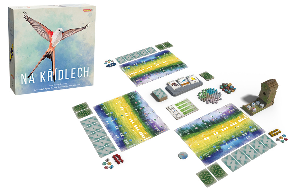 1 pravidla hry, 1 příloha, 1 pravidla sólové hry, 1 deska úkolů, 1 plastová krabička na karty, 5 voliér hráčů, 1 model budky s krmítkem, 1 bodovací zápisník, 170 různých karet ptáků, 26 karet osobních úkolů, 16 karet pro sólovou hru, 75 vajec, 5 kostek potravy, 40 akčních kostiček (po 8 v 5 barvách hráčů), 103 žetonů potravy pěti různých druhů, 8 destiček veřejných úkolů, 1 žeton začínajícího hráče