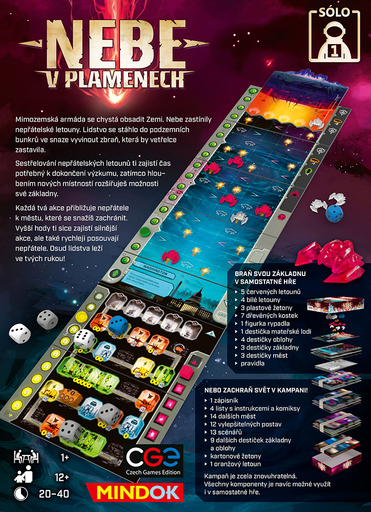 Obsah balení: 5 červených letounů, 4 bílé letouny, 3 plastové žetony, 7 dřevěných kostek, 1 figurka rypadla, 1 destička mateřské lodi, 4 destičky oblohy, 3 destičky základny, 3 destičky měst,