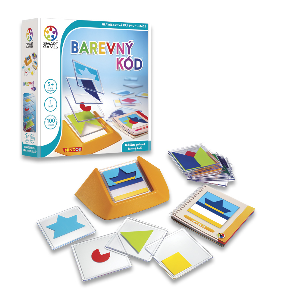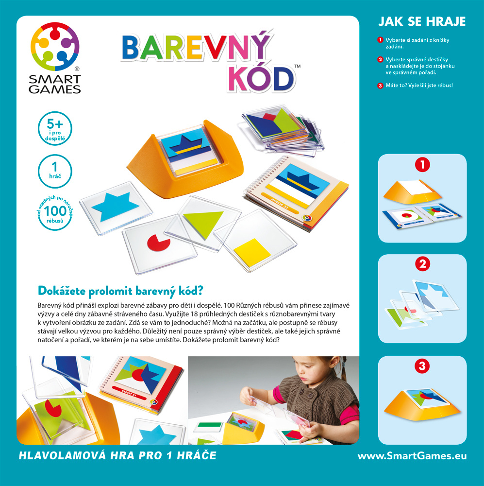 Hlavolamová hra pro 1 hráče z řady SMART games. Dílek po dílku a obrázek je tu! Barevný kód přináší explozi barevné zábavy pro děti i dospělé. 100 Různých rébusů vám přinese zajímavé výzvy a celé dny zábavně stráveného času. Využijte 18 průhledných destiček s různobarevnými tvary k vytvoření obrázku ze zadání. Zdá se vám to jednoduché? Možná na začátku, ale postupně se rébusy stávají velkou výzvou pro každého. Důležitý není pouze správný výběr destiček, ale také jejich správné natočení a pořadí, ve kterém je na sebe umístíte. Dokážete prolomit barevný kód?