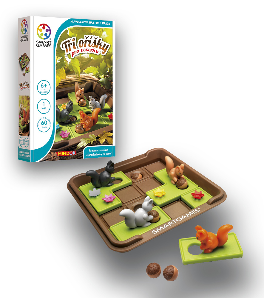 Pomozte veverkám s přípravou zásob na tuhou zimu – dokážete pohybovat veverkami tak, aby všechny oříšky či žaludy skryly do podzemních spižíren? „Tři oříšky pro veverku“ je posouvací hlavolam, ve kterém vám 60 zadání pořádně otestuje mozkové závity.