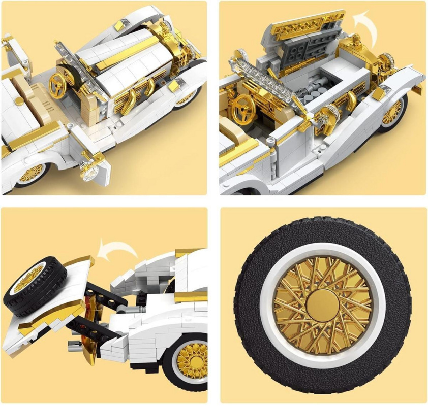 Model nabízí mnoho pohyblivých částí – otevíratelné dveře, sklopnou přední kapotu i zadní kufr. Design je inspirován atmosférou německých vozů z počátku 20. století, a tak je celý model vyveden v luxusním vintage stylu. Detailní zpracování kol, sedaček a kapoty spolu s elegantními zlatými akcenty vytváří působivý vzhled, který oživí jakýkoli interiér.