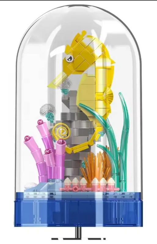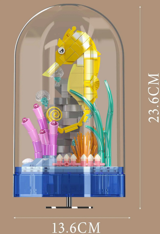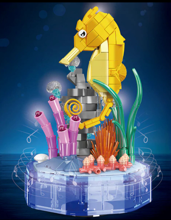 Stavebnice žlutého mořského koníka na otáčivém podstavci, který hraje hudbu. Koník je umístěn mezi pestrými korály a malým útesem. Celou scénu je možné uložit do dekorativní dózy. Tato stavebnice se skládá ze 424 dílků a její sestavení je snadné díky jasnému návodu. Mořský koník měří po sestavení včetně podstavce na výšku 23,6 cm a šířku 13,6 cm.