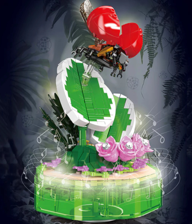 Beruška je umístěna na otočném podstavci, který přehrává melodie. Celá scéna je vyvedena v jemných barvách a působí velmi harmonicky. Tato stavebnice se hodí jako doplněk do interiéru nebo krásný dárek pro milovníky přírody a květinových motivů.