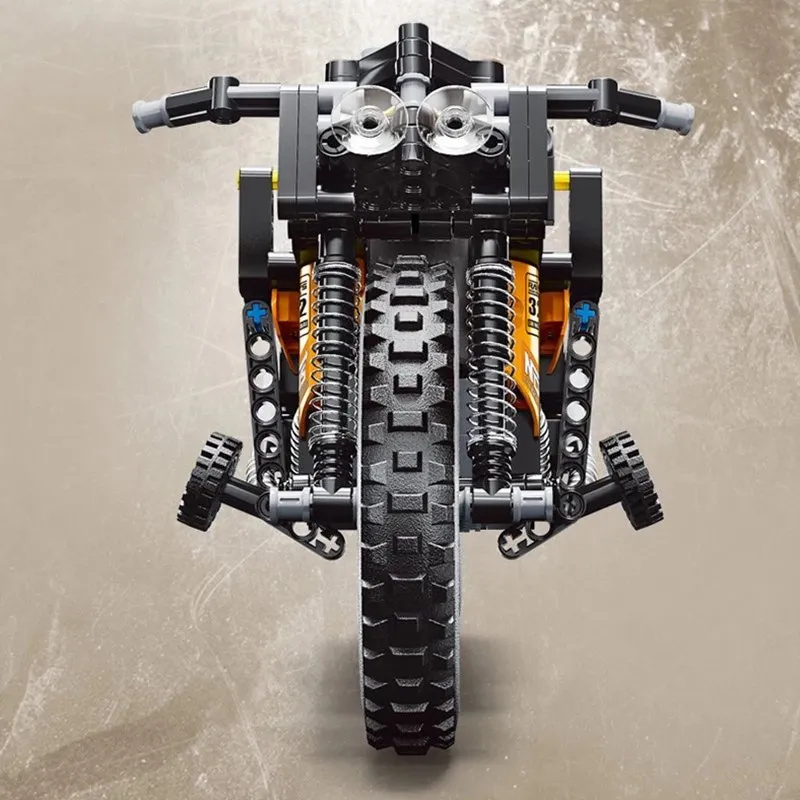 Nejprve si motorku postavíte ze 383 kvalitních dílků podle přehledného návodu. Po sestavení získáte funkční model s robustní konstrukcí, který odolá i ostřejší jízdě. Výsledný model měří 31,5 cm na délku, 12 cm na šířku a 14,5 cm na výšku – je tedy dostatečně velký, aby zaujal, ale zároveň kompaktní pro svižné ovládání.