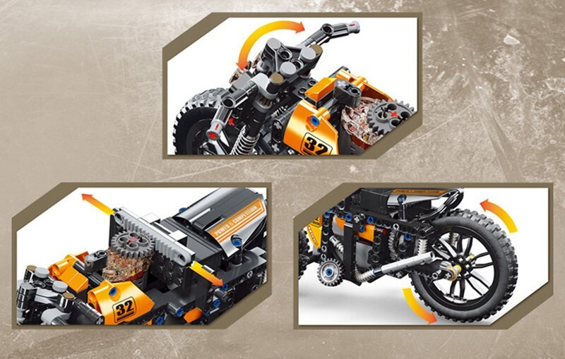 Motorka je vybavena třemi motory, z toho jeden servo motor zajišťuje přesné zatáčení. Jakmile zatočíte, servo se po projetí oblouku vrátí zpět do výchozí polohy – podobně jako u skutečné motorky. Stabilitu při jízdě zajišťují boční kolečka, která zabraňují převrácení, a umožňují tak plynulou jízdu i bez zásahů jezdce.