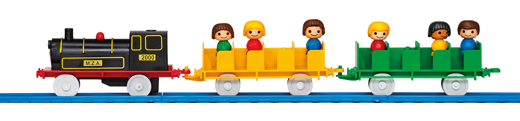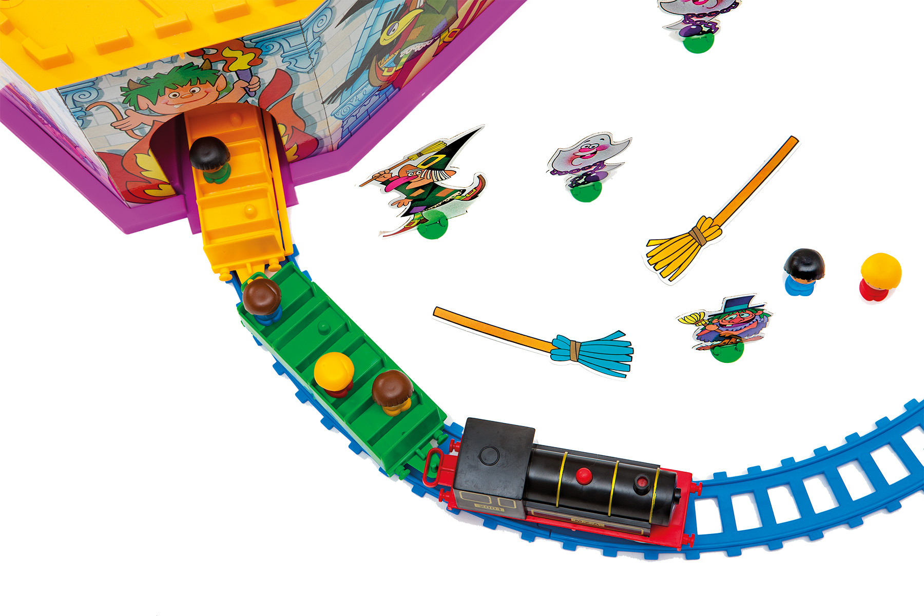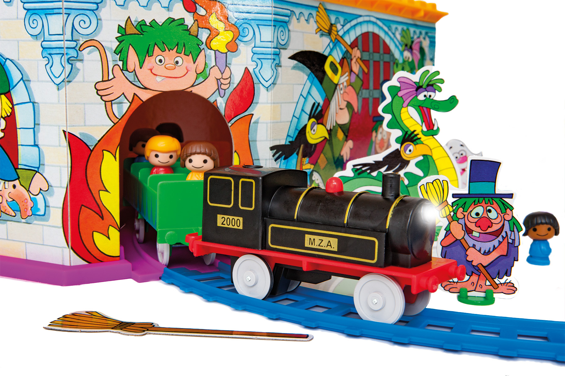 Dětský vláček na baterie, který se skládá z lokomotivy a 2 vagónů. Vláček jezdí po trati dlouhé 1,4 m. Součásti balení je strašidelný zámek, který vydává při průjezdu vlakem zvuky. Součástí sady jsou koleje, postavičky, strašidelný zámek se zvukem, plakát zámku a základny pro postavičky.