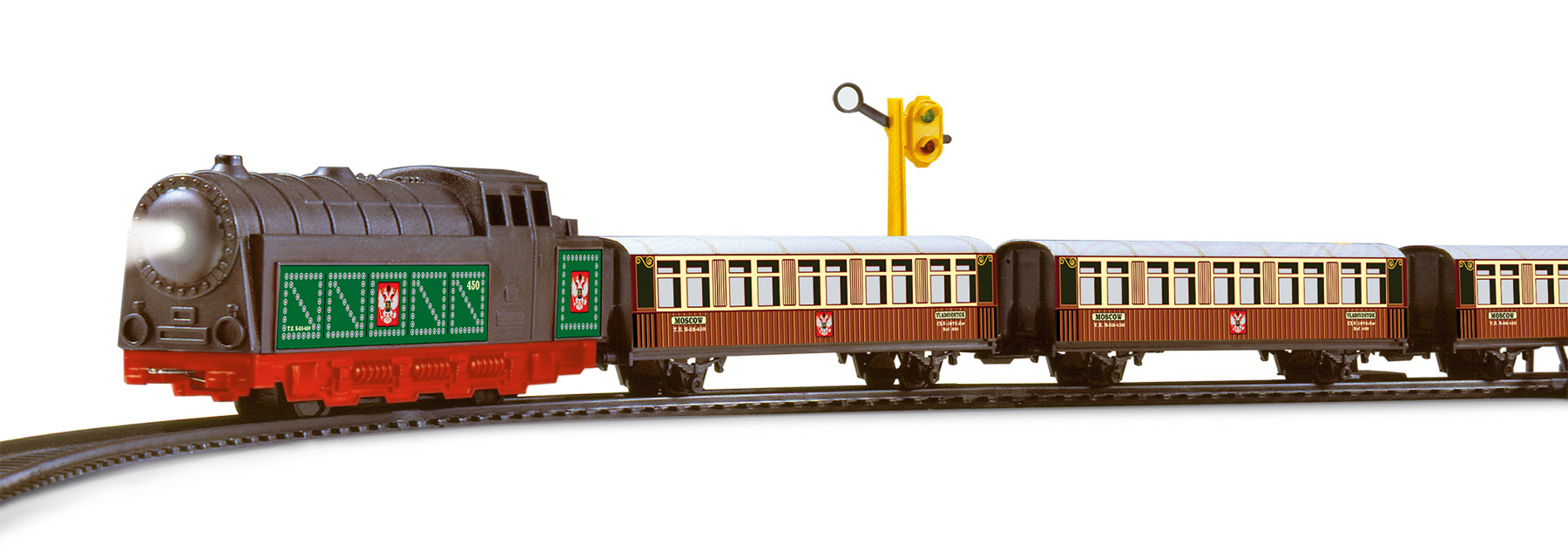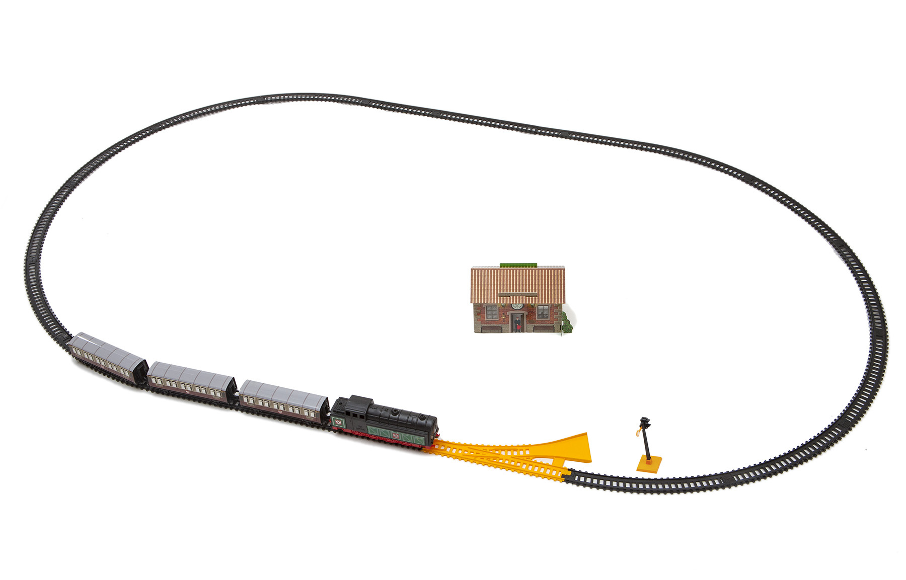 Kovový osobní vlak na baterie se skládá z lokomotivy se světlem a tří vagonů a jezdí po trati dlouhé 3,9 m. Součástí sady je i nádraží, návěstidlo a nakolejovač – pomůcka pro snazší nasazení vlaku na trať