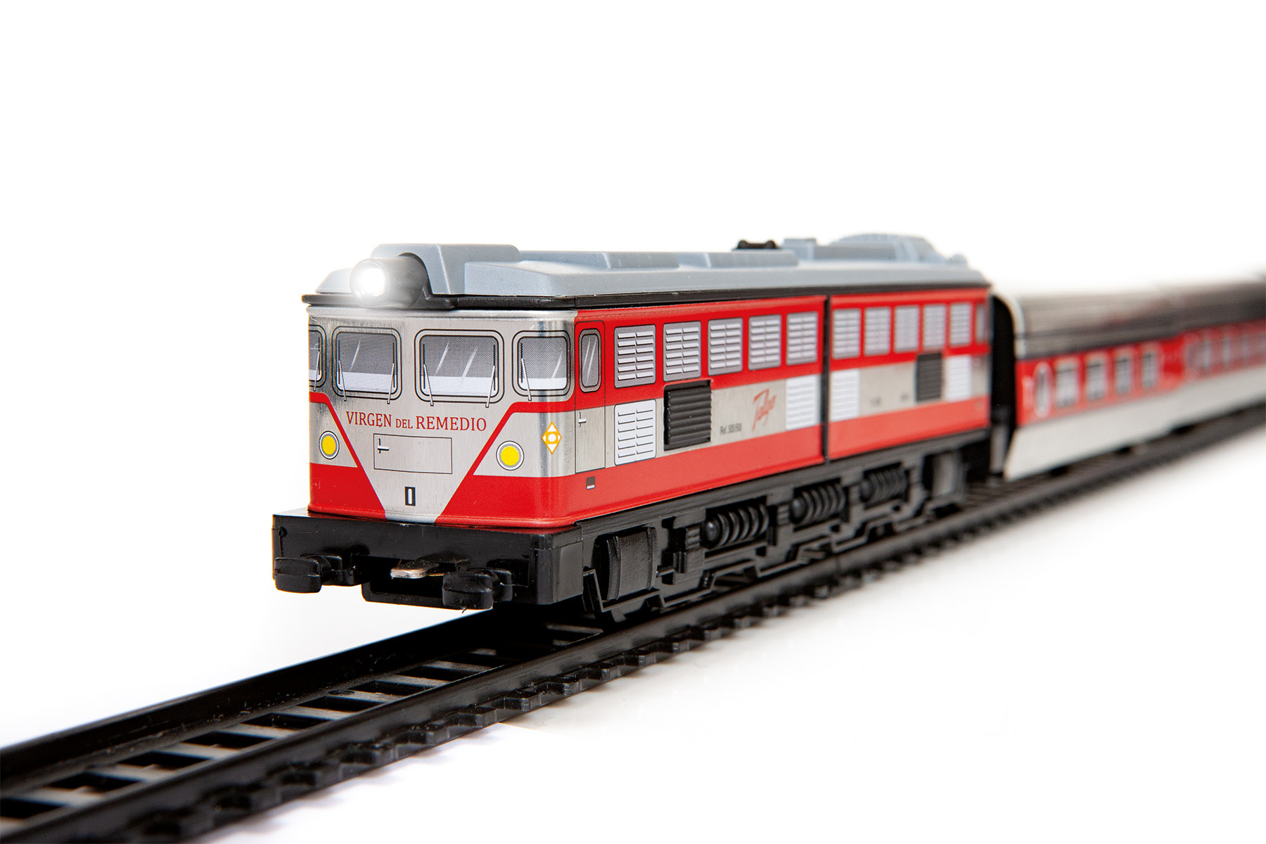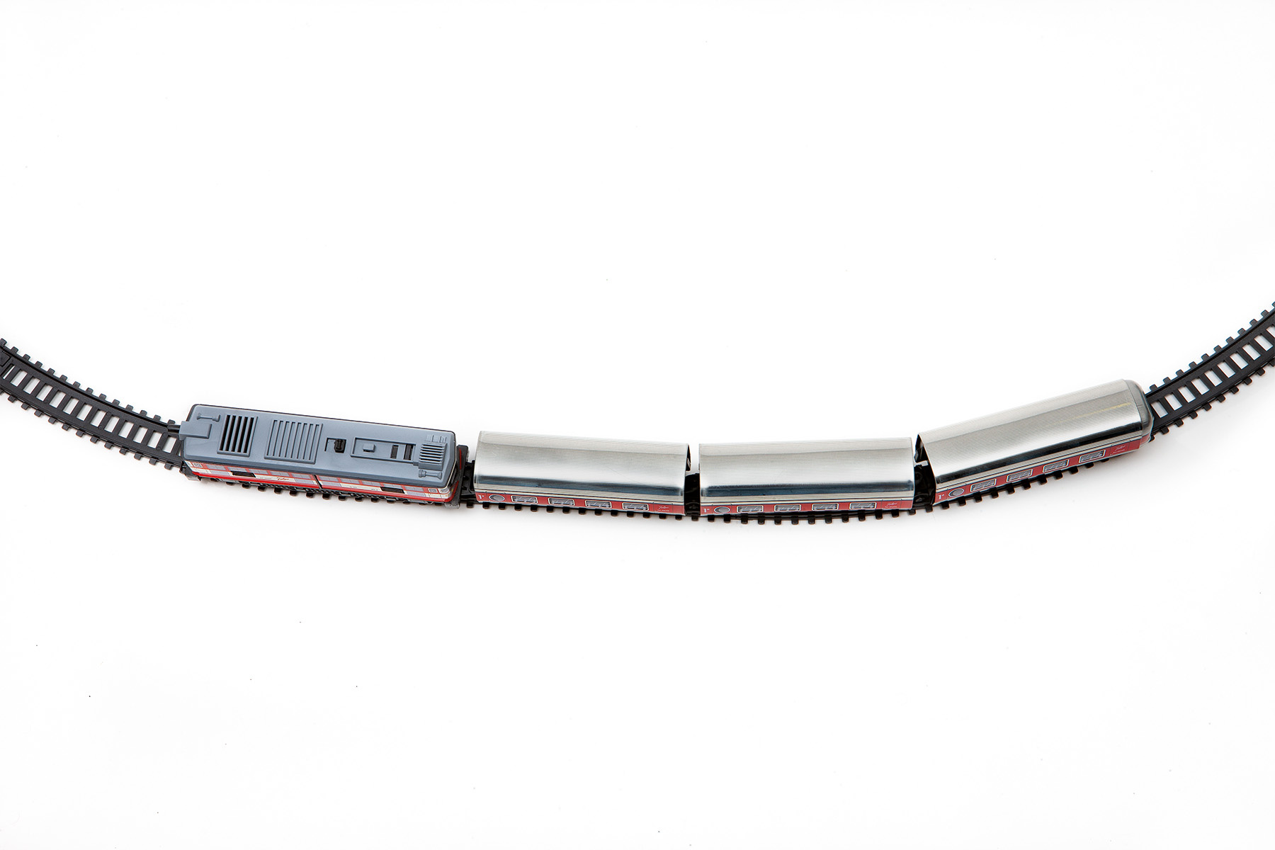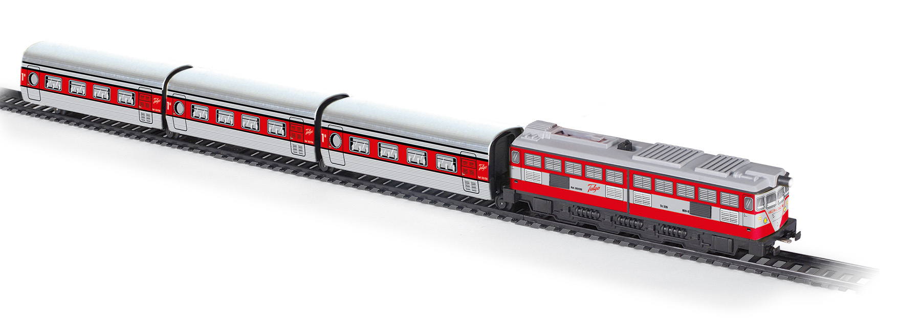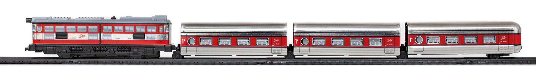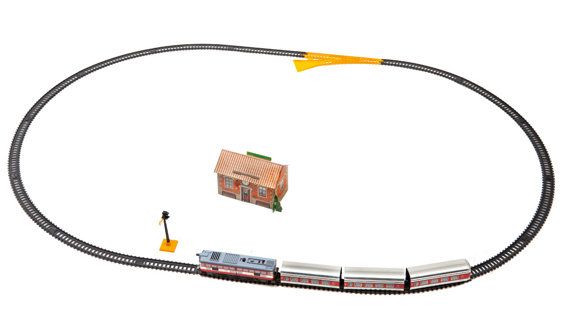 Kovový osobní kloubový vlak se skládá z lokomotivy a tří vagonů a jezdí po trati dlouhé 3,9 m. Součástí sady je i nádraží, návěstidlo a nakolejovač – pomůcka pro snazší nasazení vlaku na trať.