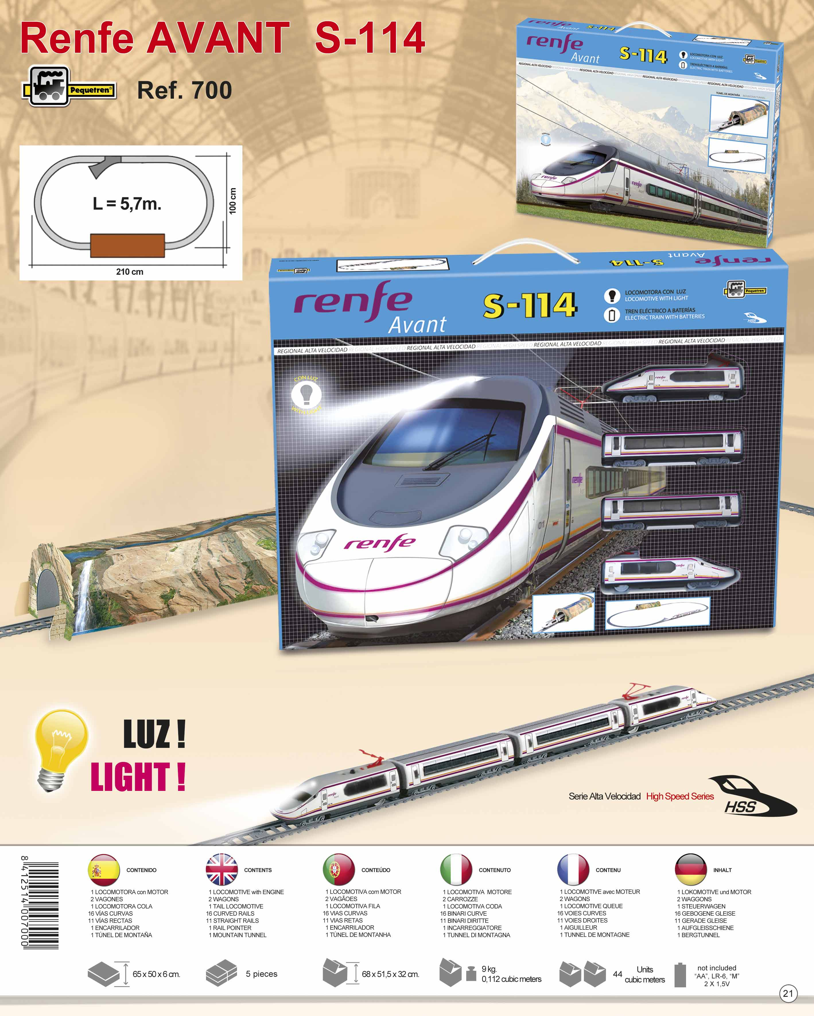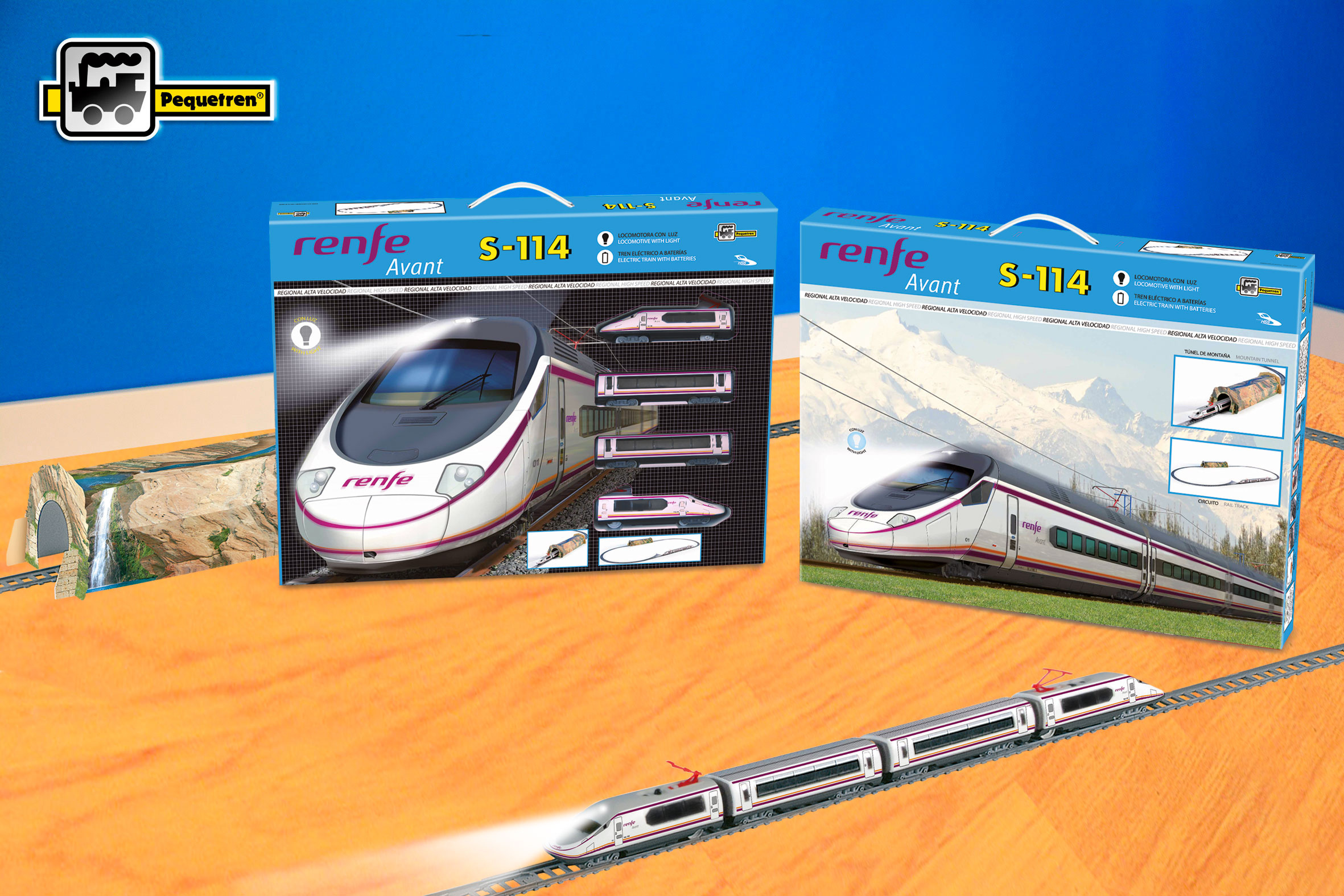 Osobní vlak na baterie se skládá ze dvou lokomotiv a dvou vagonů a jezdí po trati dlouhé 5,7 m. Součástí sady je i tunel a nakolejovač – pomůcka pro snazší nasazení vlaku na trať. Avant S-114 je komfortní vysokorychlostní vlak pro přepravu cestujících na střední vzdálenosti provozovaný španělskými dráhami Renfe. Díky použití hliníkových slitin má nízkou hmotnost, a proto má nižší spotřebu elektrické energie. Může vyvinout rychlost až 270 km/hod, maximální provozní rychlost je 250 km/h.
