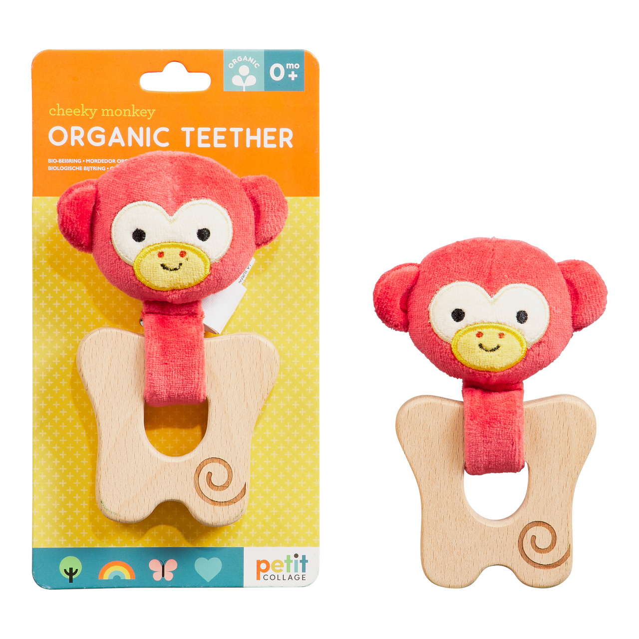Petit Collage Kousátko opička je krásná opička, která ukonejší a zabaví Vaše dítko. Kousátko je vyrobeno z organické bavlny a pevného FSC certifikovaného bukového dřeva. Vyrobeno pro malé ruce, lze jej jednoduše uchopit. Kousátko je vyplněno polyesterem a vyrobeno z recyklovaných plastových lahví a je baleno bez použití plastů.
