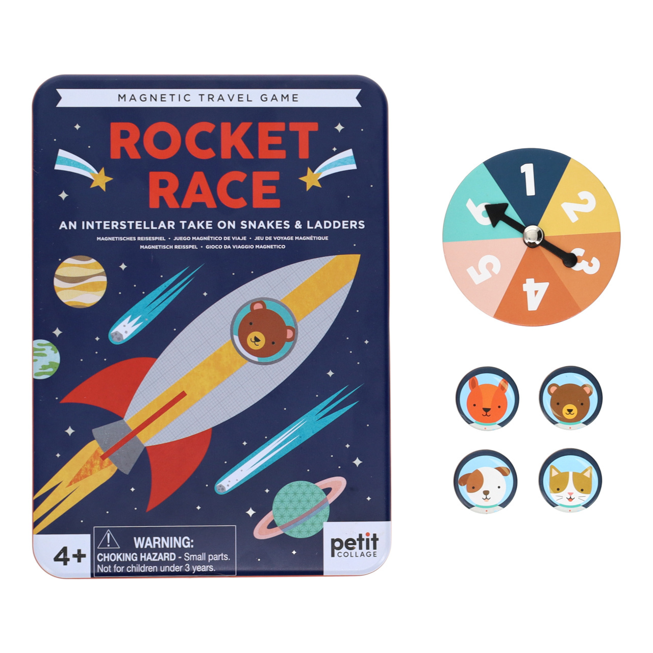 Zabaleno v recyklovatelné kovové krabičce, otevírání na panty. Po otevření odhalíte ilustrovanou hrací desku, 4 magnetické dílky, 1 kolečko s šipkou, návod hry. Vhodné pro 2-4 hráče od 4 let.