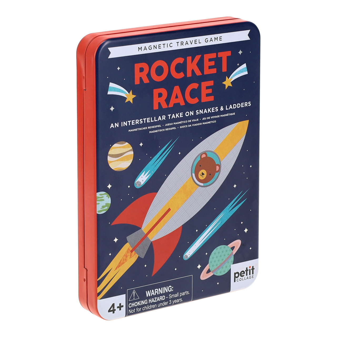 Odstartuje tento vesmírný závod! Zábavná hra v kovové krabičce plná veselých ilustrací. Hra je vesmírnou verzí Hadů a žebříků. Střídejte se v otáčení kolečka s šipkou, to ukazuje, o kolik polí se posunete. Pokud se zastavíte na políčku s hořícím palivem rakety, posuňte se vzhůru na tělo rakety. Snažte se vyhnout ohonu komety, pokud se na takovém poli zastavíte, padáte dolů, na její jádro.