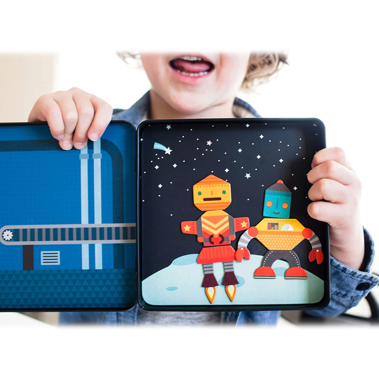 Připněte magenty na tabulku a vytvářejte různé postavičky robotů! Balení obsahuje přes 25 magnetických dílků, s kterými si děti dokáží vyhrát. Zabaleno v plechové krabičce, která se dá pevně zavřít, perfektní hračka na cesty. Plechová krabička má uvnitř, na stěnách, dvě scenérie.