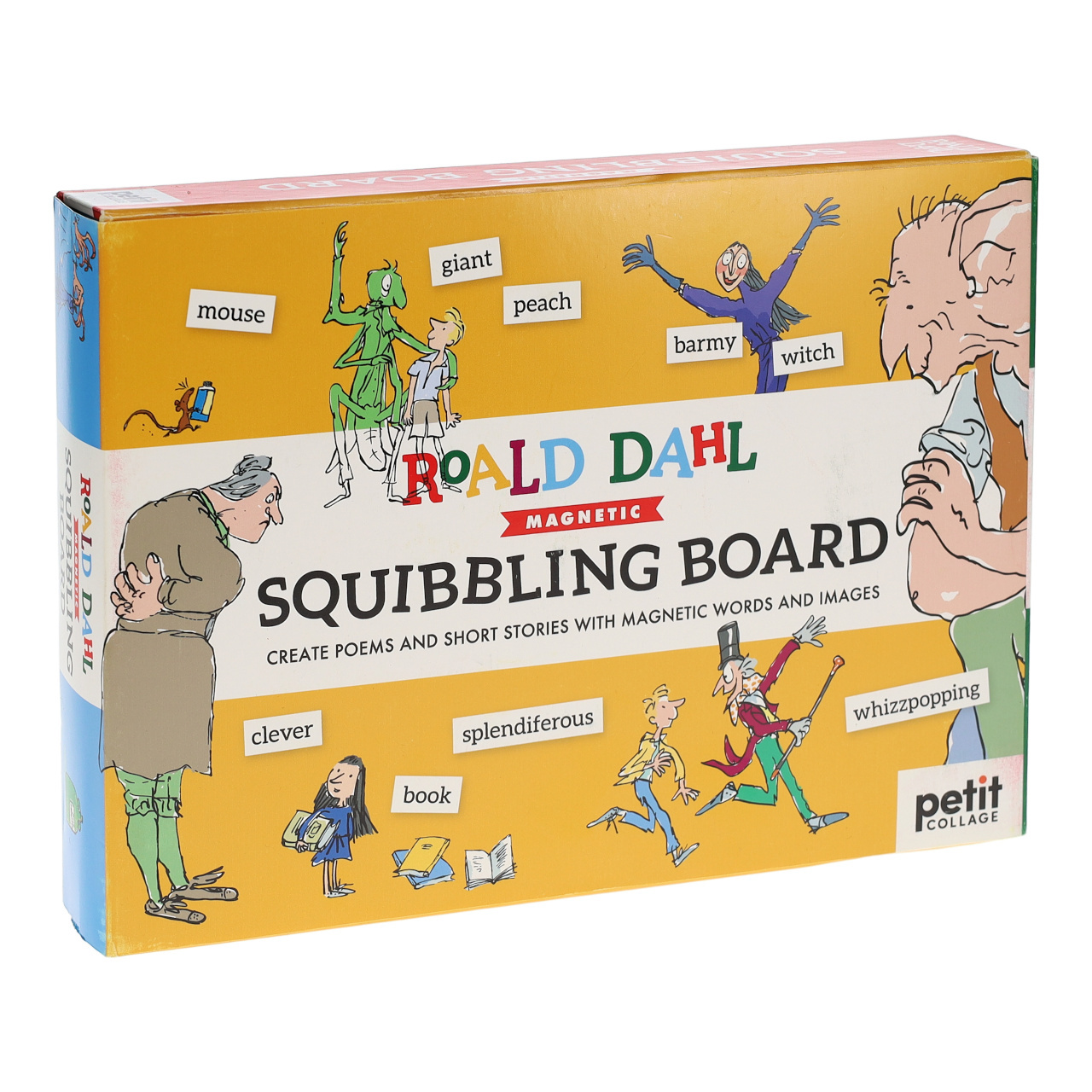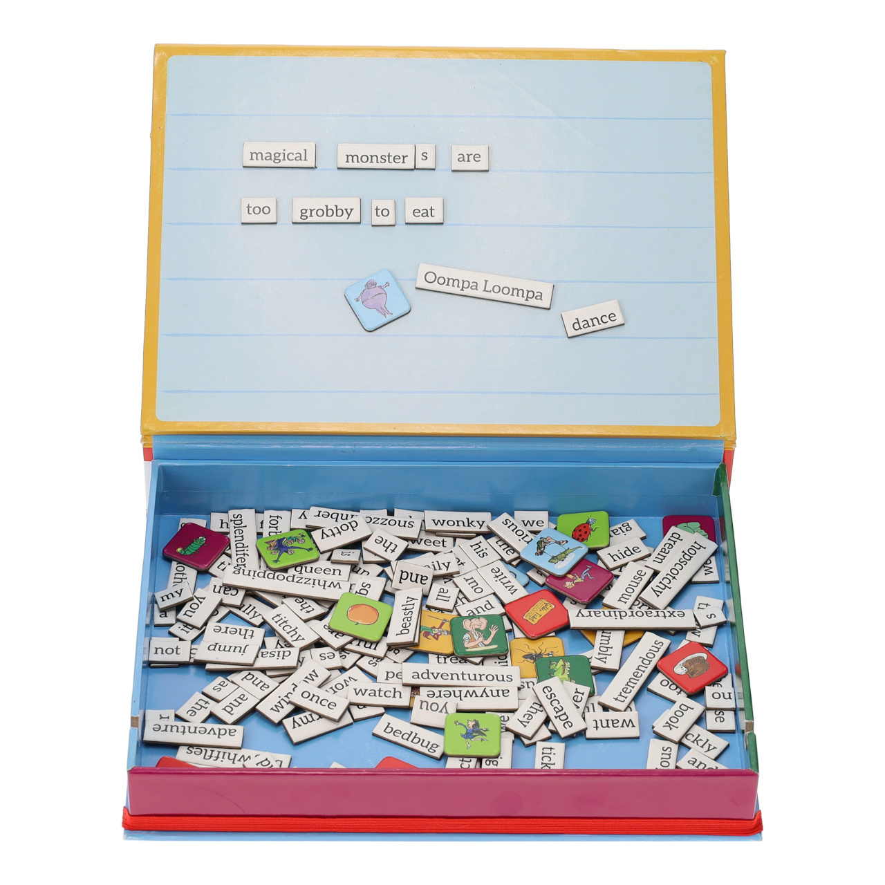 Sestavte rozverný příběh, nebo báseň pomocí pojmů užívaných v knihách Roalda Dahla. Vybírejte ze stovek magnetek se slovy a obrázky, sázejte je do řádků a tvořte originální sousloví. Hru zdobí původní, originální ilustrace z knih. Je v anglickém jazyce a je vhodnou pomůckou k procvičování angličtiny. Tabulka je společně s magnetky uložena v praktické krabičce, a je tak připravena Vás doprovázet i na cestách. Vyrobeno z udržitelně získaného papíru, potištěno rostlinnými inkousty.