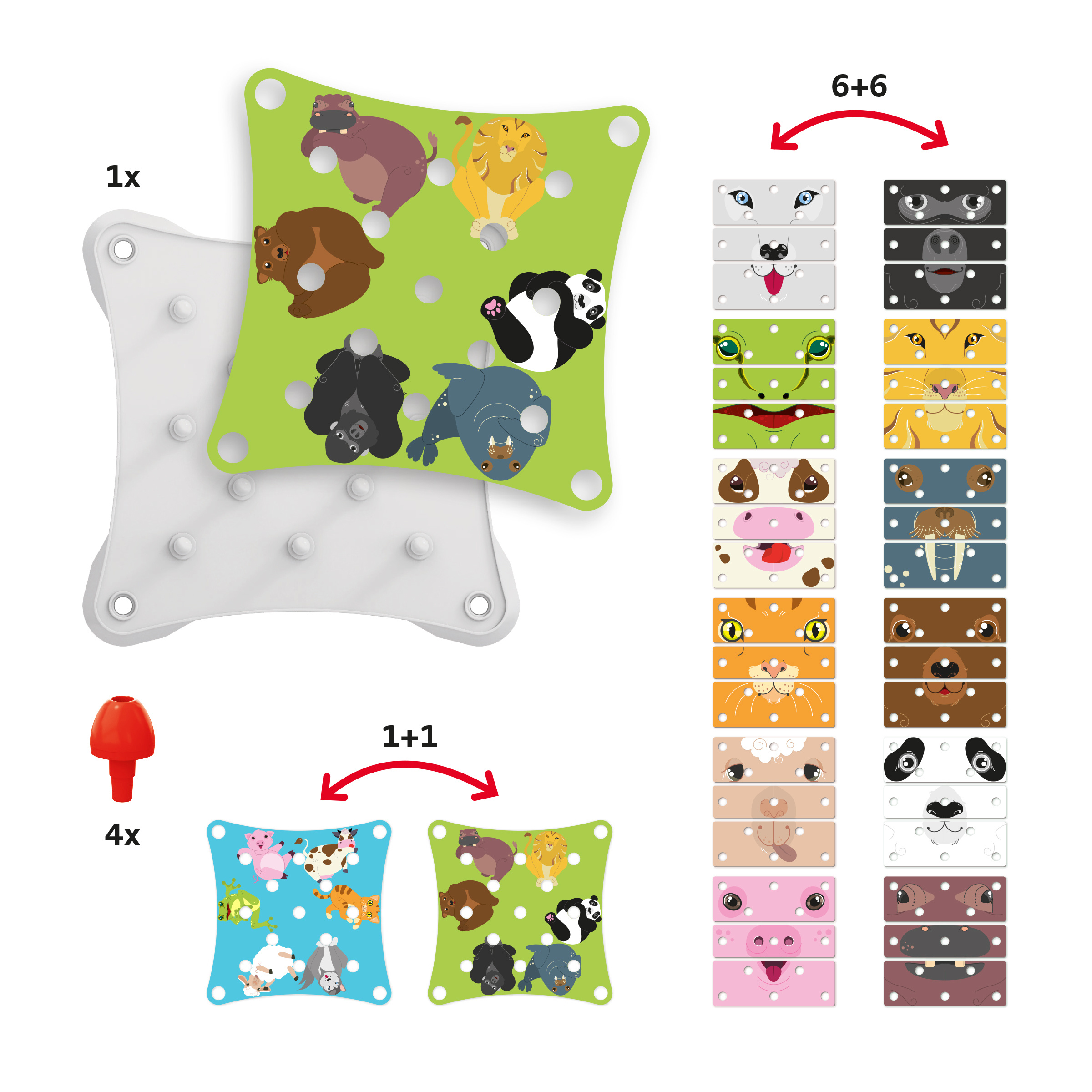 Zcela nová hra pro rozvoj vizuálního vnímání. Spousta zvířecích tváří k rozpoznání a poté smíchání v nekonečných variacích pro nekonečnou zábavu. Kompletní zvířátka pomohou dítěti s poznáním a pomíchané tváře zvířátek zase rozvíjejí dětskou fantazii.
