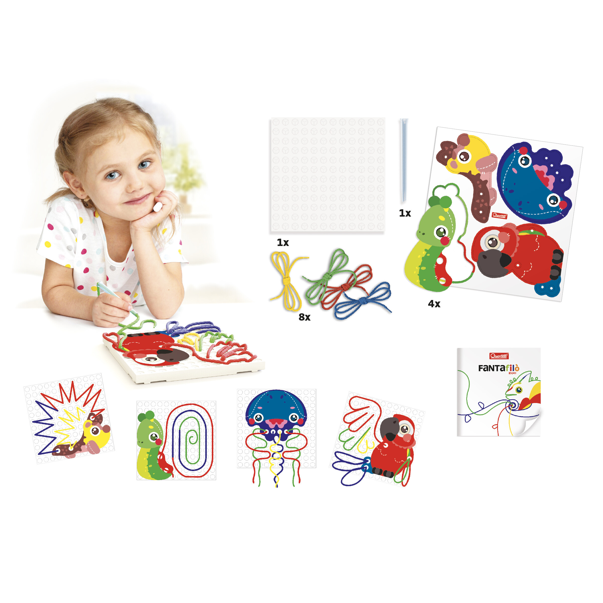 Vyšívací souprava určená dětem od 3 let. Sada obsahuje 8 šňůrek ve čtyřech základních barvách, 1 speciální pero určené k vyšívání, perforovanou desku, brožuru s předlohami a další 4 karty s předlohami, kterými se začátečníci mohou řídit. Obrázky se tvoří zasouváním šňůrek pomocí speciálního pera do otvorů hrací desky. Po nadzvednutí pera se otvor zatáhne a barevnou šňůrku pevně drží. Práce se soupravou Fantafilò pomáhá dětem uvolnit zápěstí, zlepšit vizuomotorickou koordinaci, jemnou motoriku a rozvíjí kreativitu.
