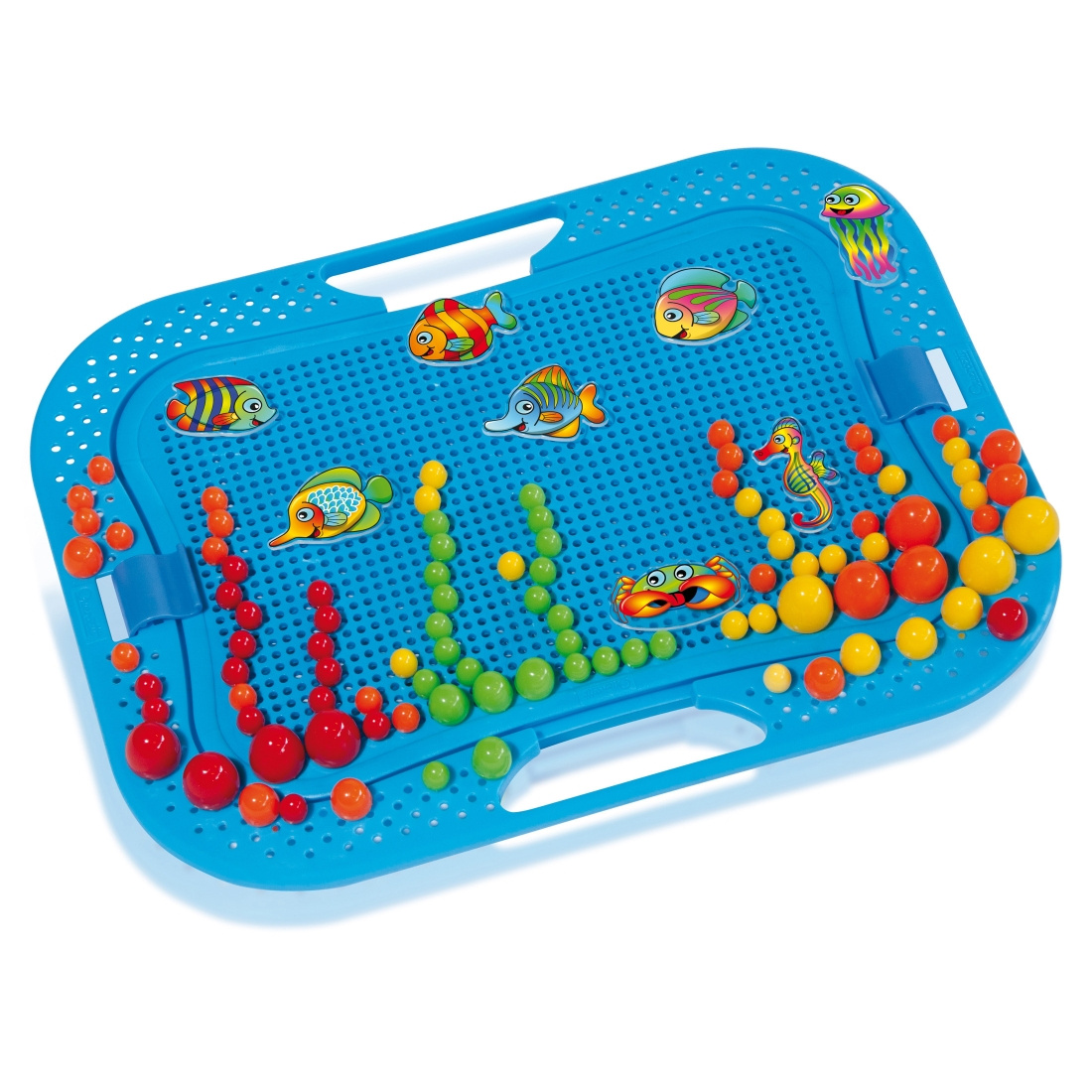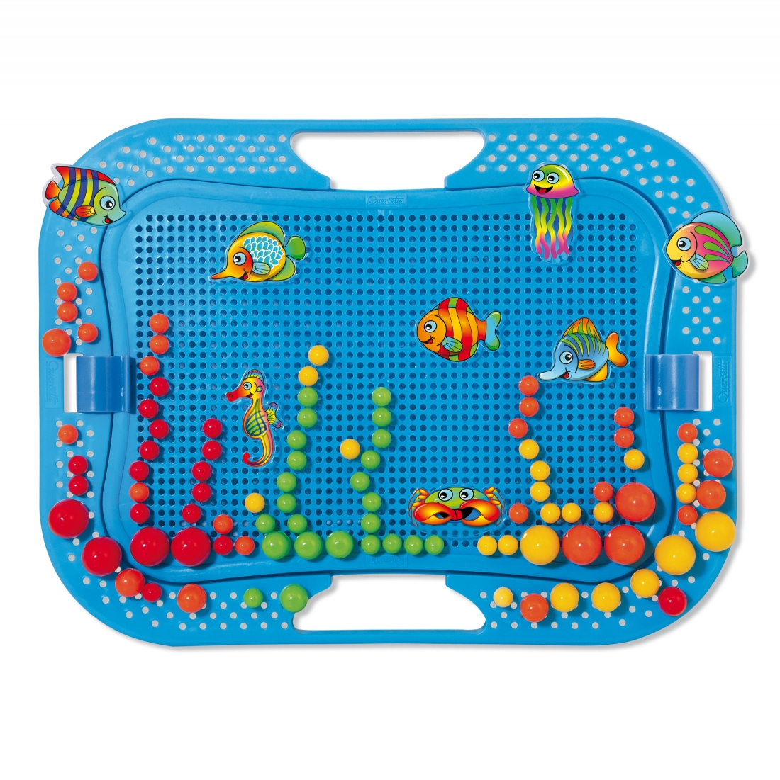 Tematicky zaměřená mozaika rozvíjející manuální zručnost, vizuomotorickou koordinaci a tvořivé myšlení. Pomocí plastových kolíčků různých velikosti dítě skládá obrázky, jež může díky speciálním doplňkům obohatit děti o malé mořské živočichy, kteří v akváriu nemohou chybět. Kufřík se dvěma úchyty, ve kterém je vše úhledně uklizeno, dělá z této mozaiky ideální hračku na cesty.