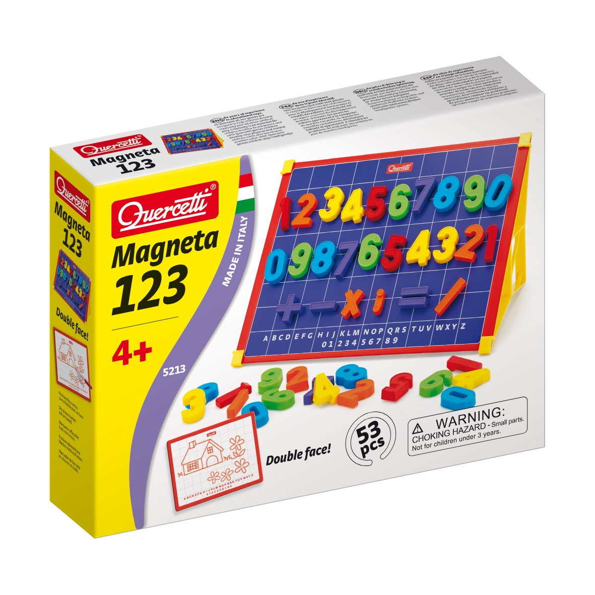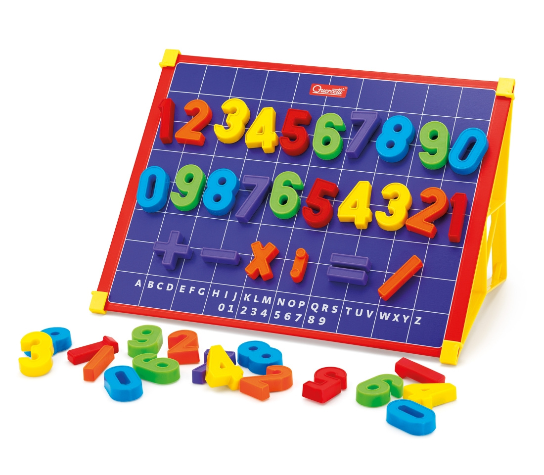 Magnetická tabulka použitelná 2 způsoby, tj. ke skládání jednoduchých početních úloh nebo k psaní a kreslení smazatelným popisovačem na druhé straně. Souprava obsahuje 48 magnetických číslic a znamének, které společně s psacími potřebami po ukončení hry uložíte do 2 podlouhlých pouzder. Souprava je určena dětem od 4 let. Smazatelný popisovač není součástí balení.