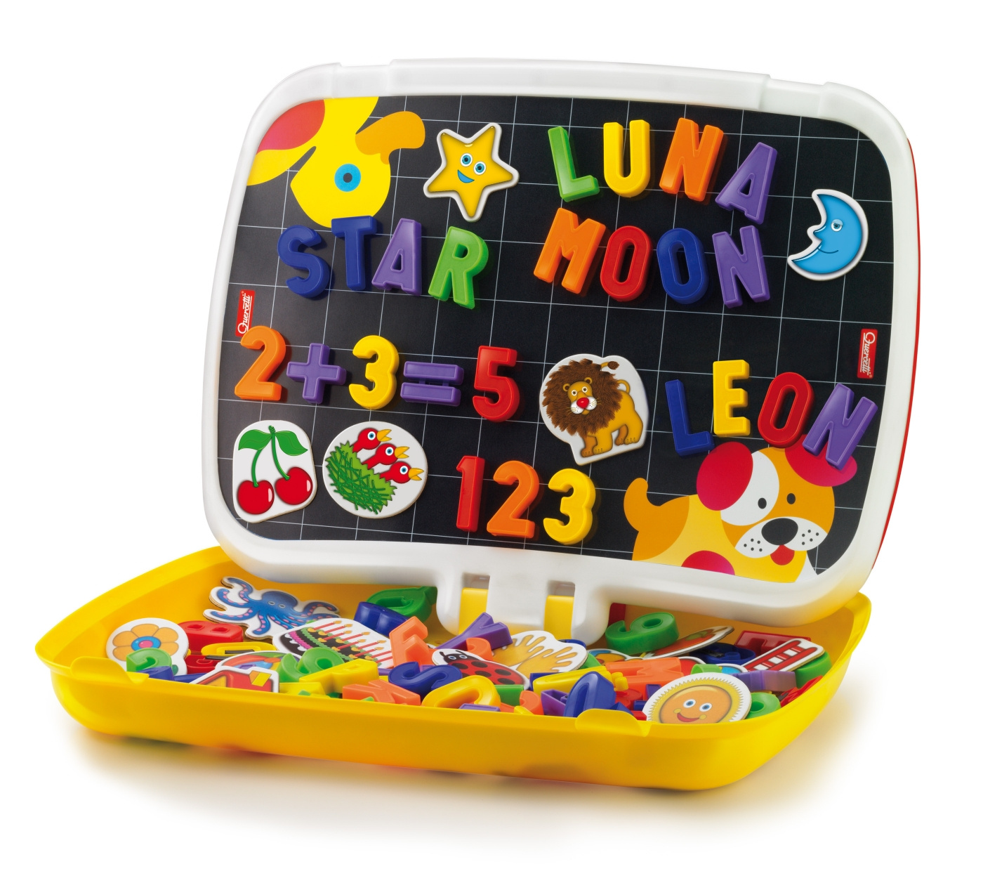 Dvě hry v jednom velkém multifunkčním kufříku: z jedné strany se učíte číst a počítat s magnetickými písmenky a číslicemi, z druhé strany můžete procvičovat psaní a kreslení na velké bílé tabuli, kterou je možno mazat.... więcej