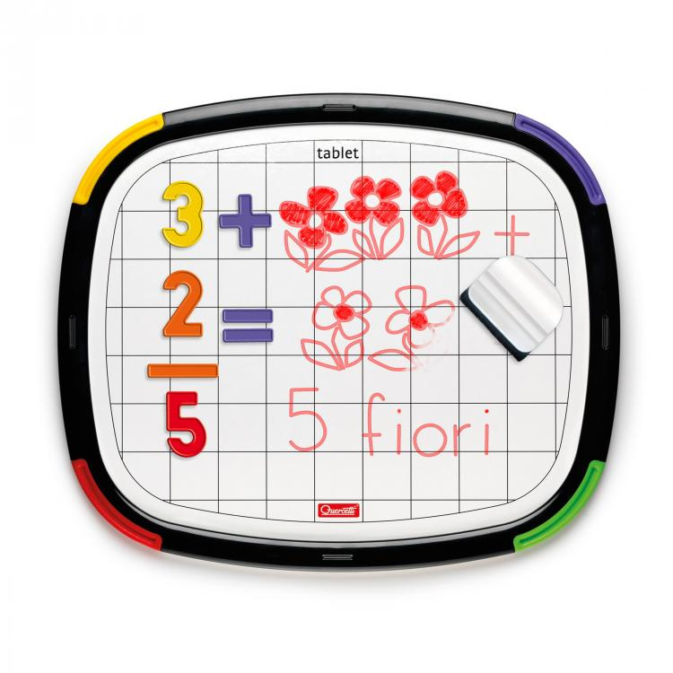 Nová řada tabulí s magnetickým povrchem na obou stranách, na kterých můžete psát. Zaoblené rohy tabulek jsou chráněny proti nárazu pomocí vložek s barevnou gumou, hračka je bezpečná, trvanlivá a odolná při manipulaci. Na číselnou tabuli lze připevňovat magnetické číslice na obě strany. Pomocí smazatelných popisovačů opatřených suchou plstí je na ni možno psát nebo kreslit. Vedle čísel lze připevňovat magnetické karty z pevné lepenky. Design karet působí jako stimulace pro správné řešení snadných matematických výpočtů. Sada obsahuje praktické příslušenství, které lze zavěsit na kterékoli místo rámu a které slouží k umístění suchého popisovače a mazací gumy. Její součástí jsou rovněž transparentní nožičky, pomocí nichž můžete zvolit dvě různé možnosti sklonu tabule, ať již v horizontálním, nebo vertikálním směru.