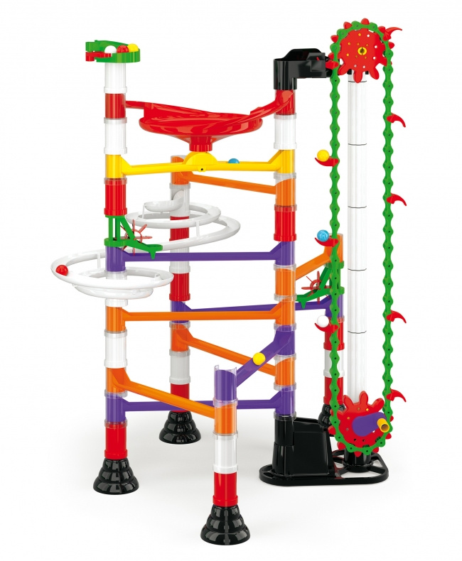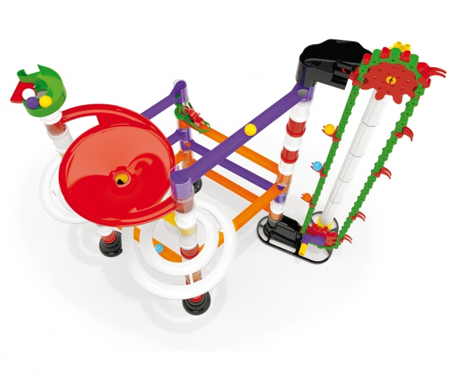 Vytvořte si díky naší úžasné stavebnici svou vlastní kuličkovou dráhu. Postavte si modely vyobrazené na krabici nebo si užijte experimenty s vlastními návrhy. Všechny vzájemně do sebe zapadající skluzavky, můstky, sloupky, lopatková kola, spirály a trychtýře vám nabízejí nekonečnou škálu kombinací a zaručují zábavu na dlouhou dobu. Hračka rozvíjí tvořivost a logické myšlení, jež jsou ke stavbě krásných, ale hlavně funkčních drah se správným sklonem zcela nezbytné. Díky úžasnému výtahu můžete nyní vytvářet nekonečné množství kuličkových kaskád s okouzlujícím vizuálním efektem. Určeno pro děti od 5 let.