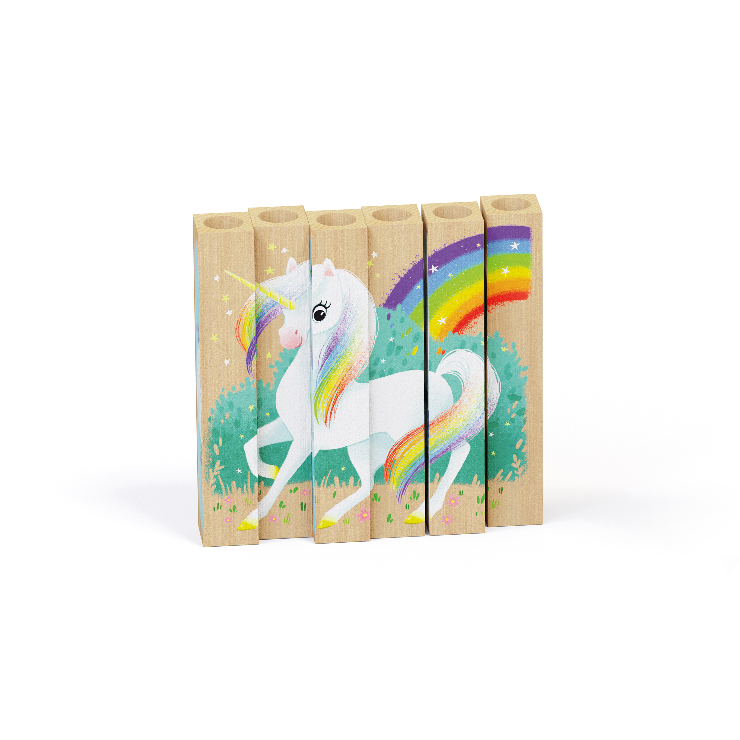 Šest lehkých dřevěných bloků pro horizontální a vertikální skládání obrázků pohádkových zvířat. Tato zdánlivě snadná hra je překvapivě náročná a velmi poutavá pro malé děti. Vyrobeno z udržitelných materiálů v sérii PLAYBIO. Vhodné pro děti od 2 let.