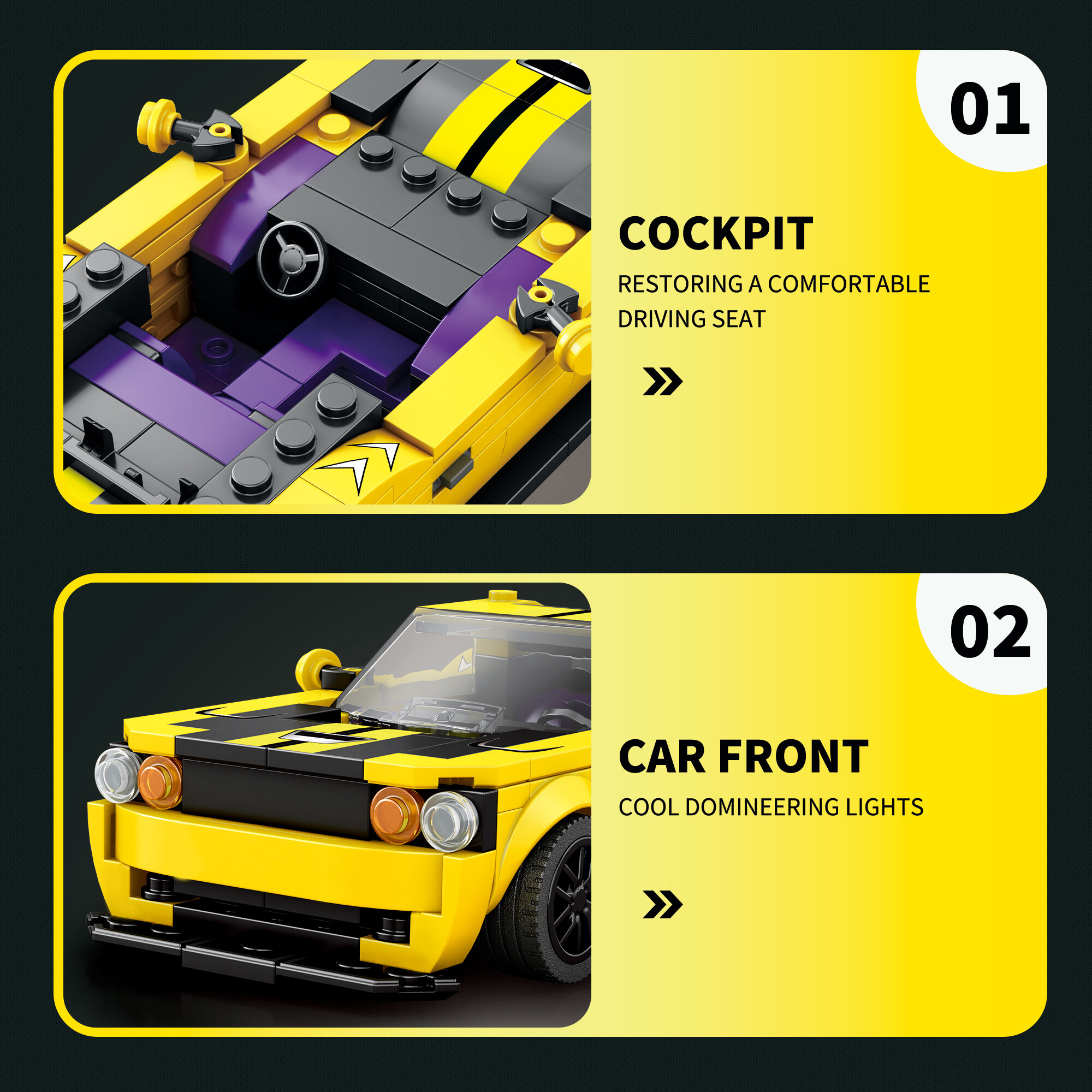 Tento elegantní sportovní vůz v typické žluté barvě s černými pruhy představuje kombinaci síly, výkonu a precizního designu. Každý detail je pečlivě zpracovaný – od nízkého profilu karoserie až po realisticky tvarovaný předek a záď.